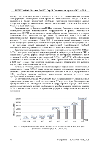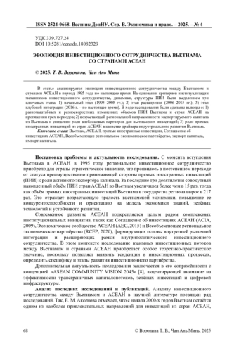 В статье анализируется эволюция инвестиционного сотрудничества между Вьетнамом и странами АСЕАН в период 1995 года по настоящее время. На основании критериев институализации механизмов инвестиционного сотрудничества, динамики, структуры ПИИ были выделением три ключевых этапа: 1) начальный этап (1995-2005 гг.); 2) этап расширения (2006-2015 гг.); 3) этап глубокой интеграции (2016 г. - по настоящее время). В ходе исследования были сделаны выводы о: 1) разномаштабных и разноскоростных изменениях объемов ПИИ Вьетнама и стран АСЕАН на протяжении трех периодов; 2) возрастающей региональной направленности экспортируемого капитала из Вьетнама и снижении роли внеблоковых партнеров для вьетнамских инвестиций; 3) роли прямых иностранных инвестиций из стран АСЕАН в качестве драйвера индустриального развития Вьетнама.