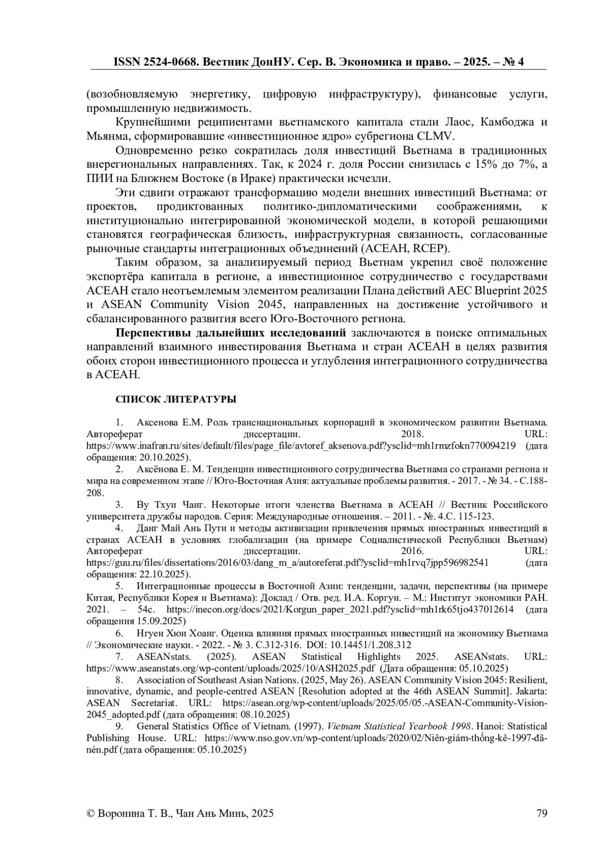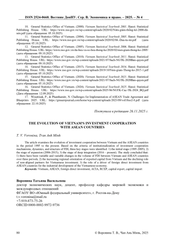 1. Аксенова Е.М. Роль транснациональных корпораций в экономическом развитии Вьетнама. Автореферат диссертации. 2018. URL: https://www.inafran.ru/sites/default/files/page_file/avtoref_aksenova.pdf?ysclid=mh1rmzfokn770094219 (дата обращения: 20.10.2025). EDN: GZRIXA
