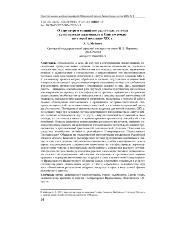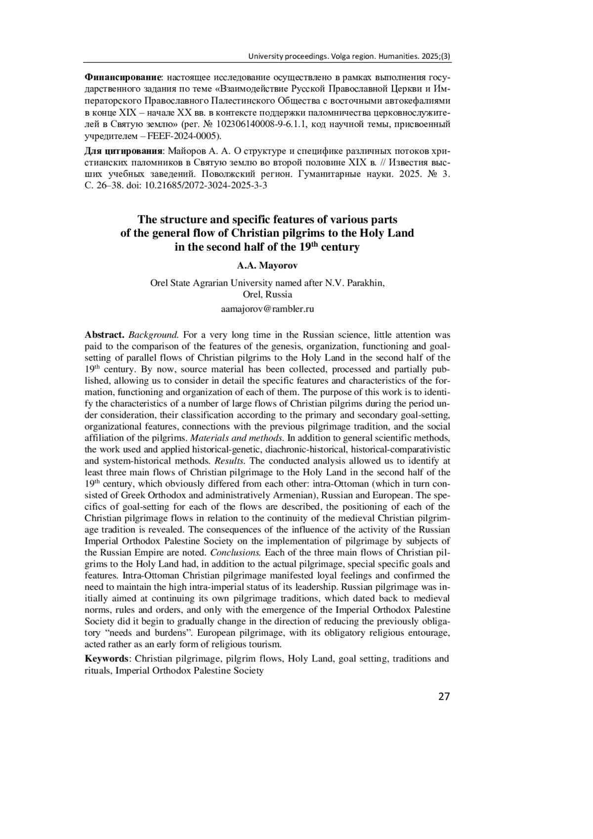 30. Майоров А. А. Традиции паломнического движения в России как одна из основ успешного становления Императорского Православного Палестинского общества // Вестник государственного и муниципального управления. 2024. Т. 13, № 4. С. 101-114. EDN: UVFWKT