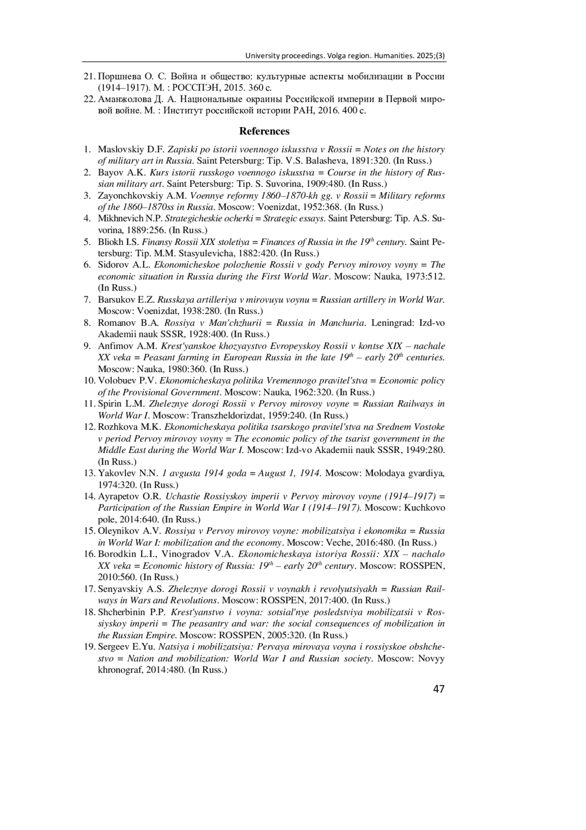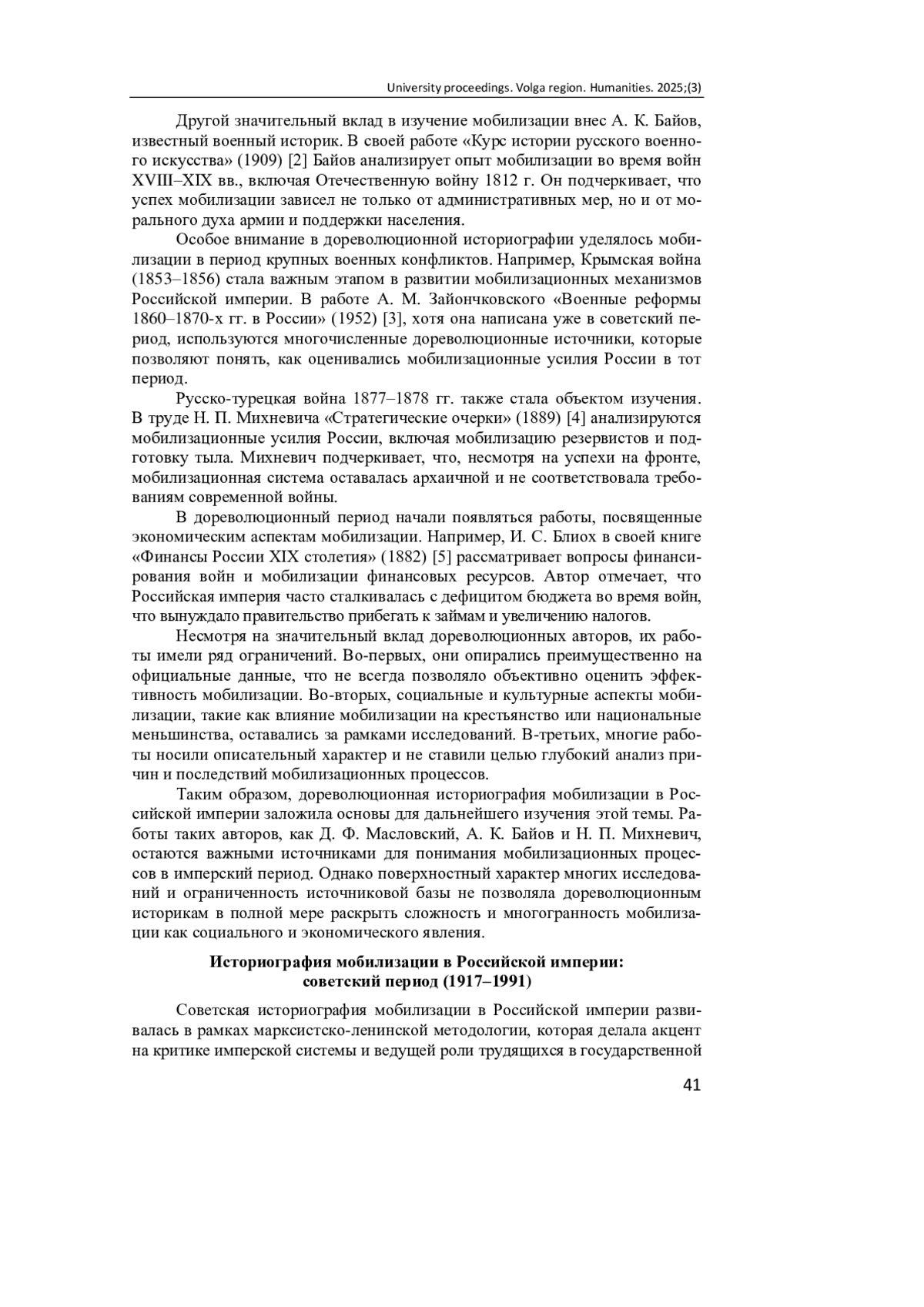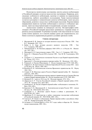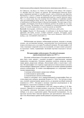 Актуальность и цель. Вопросы мобилизационной подготовки и мобилизации всегда актуальны, ведь население России систематически подвергалось внешним угрозам и для отражения этих угроз необходимо было иметь организованную армию. Цель исследования - проанализировать историографию мобилизации в Российской империи и выявить ее основные подходы и тенденции. Материалы и методы. Анализируются работы таких авторов, как Д. Ф. Масловский, А. К. Байов, А. Л. Сидоров, Е. З. Барсуков, А. М. Анфимов, О. Р. Айрапетов, Л. И. Бородкин и Е. Ю. Сергеев. Методологическая база охватывает основополагающие принципы научного исследования, такие как историзм и объективность. Герменевтика используется как способ интерпретации текста, а историко-ситуационный анализ позволяет оценивать события и явления, опираясь на конкретную историческую обстановку. Это в определенной мере освобождает исследователя от воздействия устоявшихся научных представлений и методологических клише. Результаты. Проанализировано отражение вопроса мобилизации в Российской империи в отечественной историографии. Рассмотрены основные этапы развития историографии начиная с дореволюционного периода и заканчивая современным этапом. Выводы. Анализ литературы представлен в исторической ретроспективе. Выявлена специфика научных трактовок на том или ином временном отрезке.