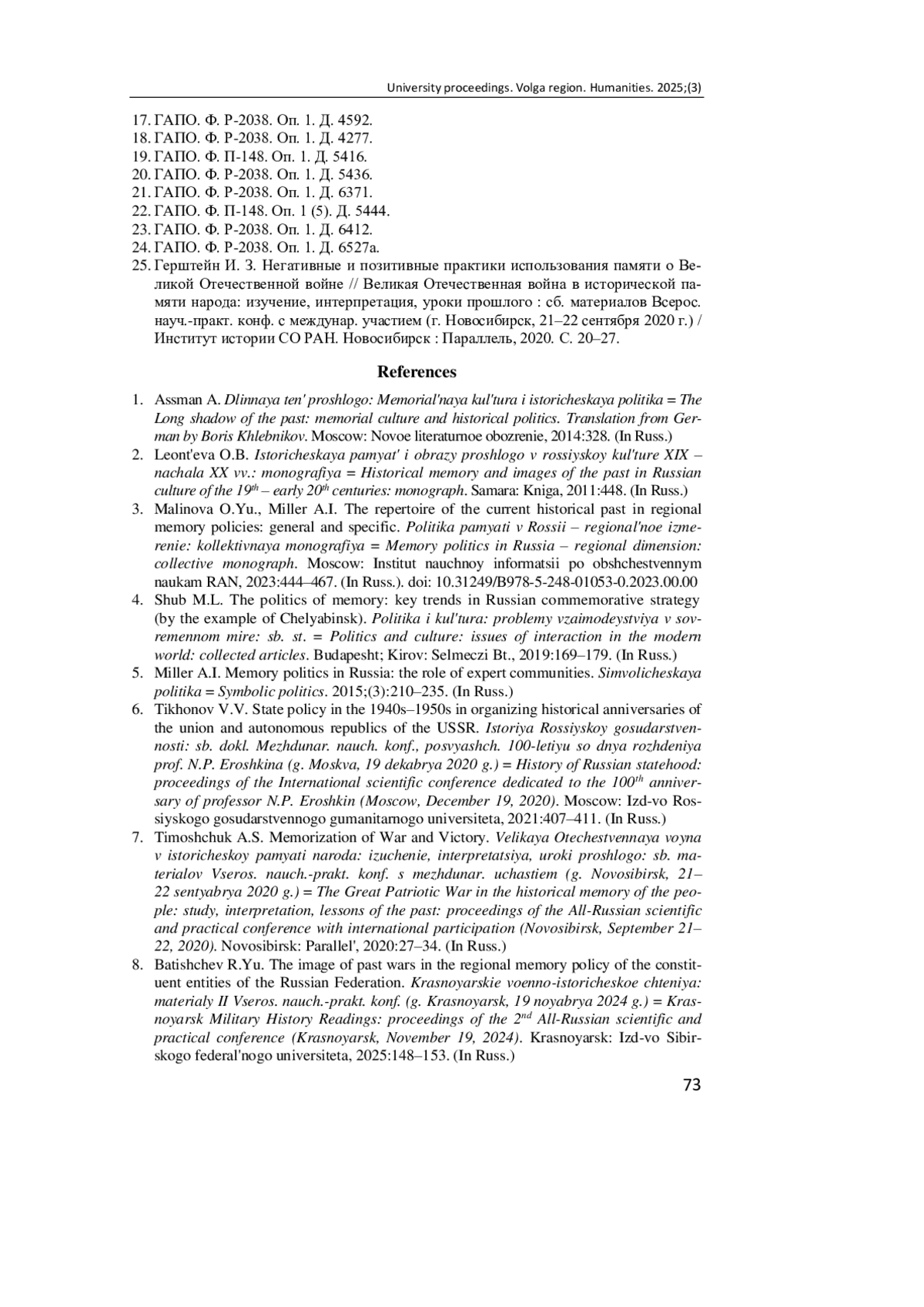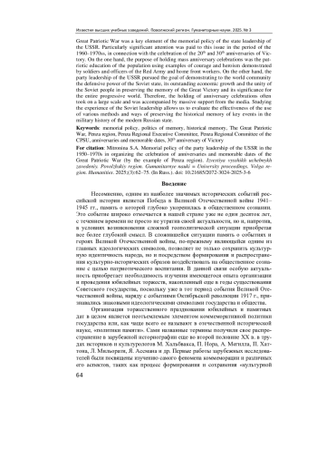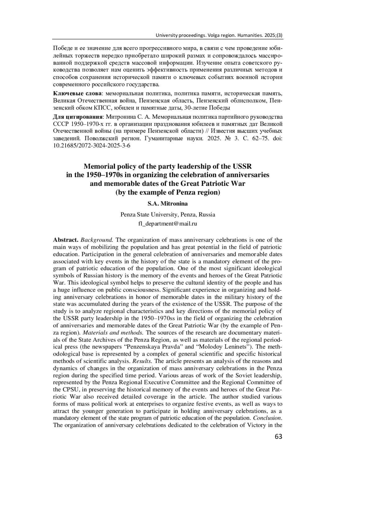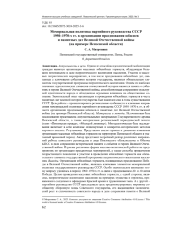 Актуальность и цели. Одним из способов идеологической мобилизации граждан является организация массовых юбилейных торжеств, обладающая большим потенциалом в деле патриотического воспитания населения. Участие в массовых патриотических мероприятиях, в том числе праздновании юбилейных дат, связанных с ключевыми событиями истории государства, является обязательным элементом государственной программы патриотического воспитания. Одним из наиболее значимых идеологических символов отечественной истории является память о событиях и героях Великой Отечественной войны, способствующая сохранению культурной идентичности народа и обладающая огромным влиянием на общественное сознание. Значительный опыт организации и проведения юбилейных торжеств в честь памятных дат военной истории государства был накоплен еще в годы существования СССР. Цель работы - проанализировать региональные особенности и ключевые направления мемориальной политики партийного руководства СССР 1950-1970-х гг. в области организации празднования юбилеев и памятных дат Великой Отечественной войны (на примере Пензенской области). Материалы и методы. Источниковая база исследования представлена документальными материалами Государственного архива Пензенской области, а также материалами региональной периодической печати (газет «Пензенская правда», «Молодой ленинец»). Методологическая база исследования включает в себя комплекс общенаучных и конкретно-исторических методов научного анализа. Результаты. Представлен анализ причин и динамики изменения организации массовых юбилейных торжеств на территории Пензенской области в указанный временной период. Автор представил подробный разбор различных направлений работы советского руководства в лице Пензенского облисполкома и Обкома КПСС в деле сохранения исторической памяти о события и героях Великой Отечественной войны. Изучены различные формы массово-политической работы на предприятиях по организации праздничных мероприятий, а также способы привлечения подрастающего поколения к участию в проведении юбилейных торжеств как обязательного элемента государственной программы патриотического воспитания населения. Выводы. Организация юбилейных торжеств, посвященных празднованию Победы в Великой Отечественной войне, являлась ключевым элементом мемориальной политики государственного руководства СССР. Особо значительное внимание этому вопросу уделялось в период 1960-1970-х гг. в связи с празднованием 20- и 30-летия Победы. Целью проведения массовых юбилейных торжеств, с одной стороны, являлось патриотическое воспитание населения на примерах мужества и героизма, проявленного солдатами и офицерами Красной армии и тружениками тыла. А с другой - партийное руководство СССР преследовало цель продемонстрировать мировому сообществу оборонную мощь Советского государства, его выдающийся экономический рост и сплоченность советского народа в деле сохранения памяти о Великой Победе и ее значение для всего прогрессивного мира, в связи с чем проведение юбилейных торжеств нередко приобретало широкий размах и сопровождалось массированной поддержкой средств массовой информации. Изучение опыта советского руководства позволяет нам оценить эффективность применения различных методов и способов сохранения ист