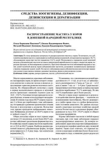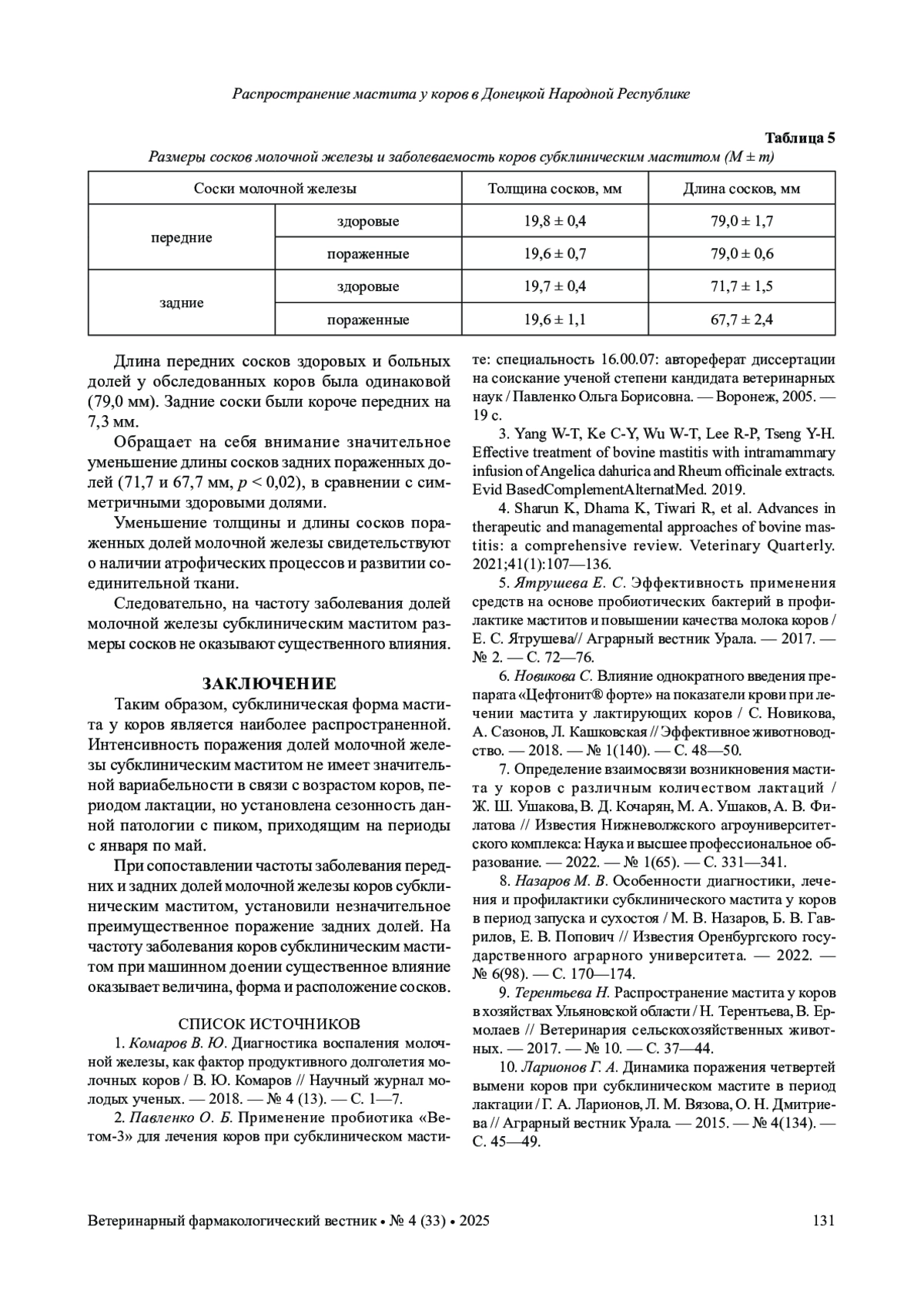 9. Терентьева Н. Распространение мастита у коров в хозяйствах Ульяновской области / Н. Терентьева, В. Ермолаев // Ветеринария сельскохозяйственны х животных. - 2017. - № 10. - С. 37-44. EDN: YVFKVN