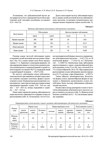 В статье приведены материалы по распространению мастита у коров. Установлено, что субклиническая форма мастита у коров является наиболее распространенной, которая диагностирована у 34,5 % обследованных коров при частоте поражения 12,6 % долей. Интенсивность поражения долей молочнойжелезы субклиническим маститом не имела значительной вариабельности в связи с возрастом коров, периодом лактации, но была выражена сезонность. При сопоставлении частоты заболевания передних и задних долей молочной железы коров субклиническим маститом, установили незначительное преимущественное поражение задних долей. На частоту заболевания коров субклиническим маститом при машинном доении существенное влияние оказывает величина, форма и расположение сосков.