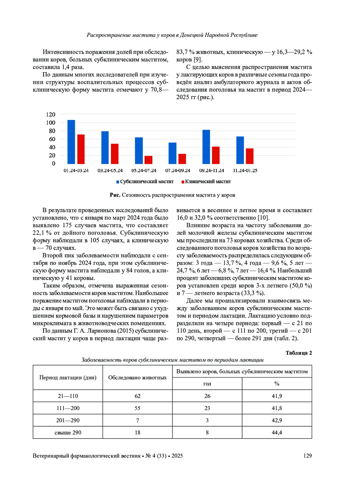 В некоторых хозяйствах Ульяновской области уровень мастита составлял от 26,17 до 31,03 %. При этом соотношение клинического мастита к скрытому составляет приблизительно 1:2. На наш взгляд, причиной послужило изменение условий содержания, а именно: отказ руководства и ветеринарной службы хозяйства от организации выгула коров, пастьбы в летний период [9].