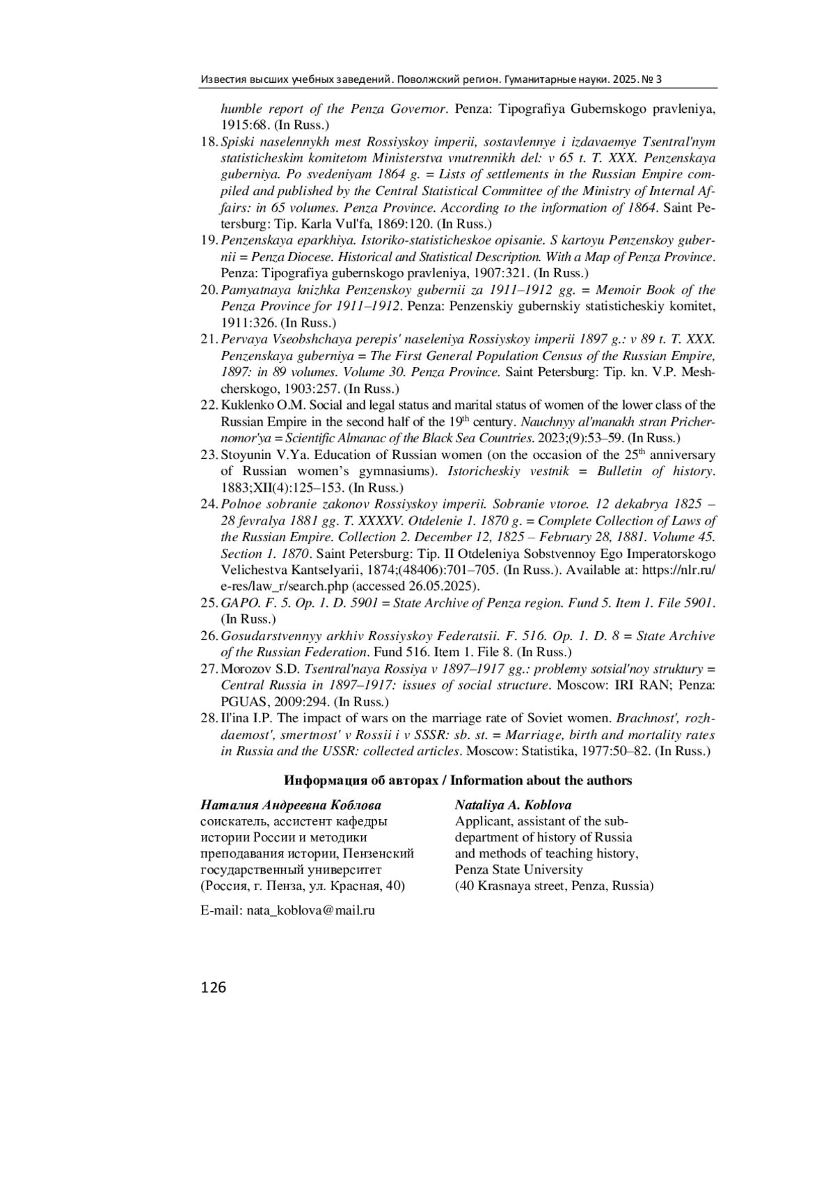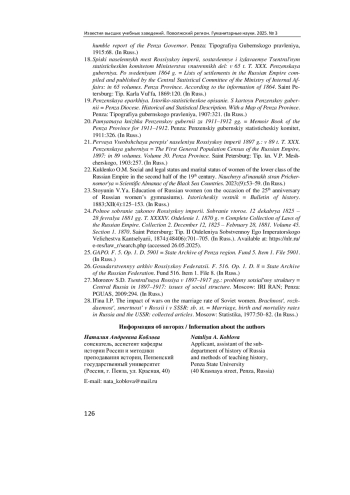 22. Кукленко О. М. Социально-правовой статус и семейное положение женщин духовного сословия Российской империи во второй половине XIX века // Научный альманах стран Причерноморья. 2023. № 9 (3). С. 53-59. EDN: EGGLIX