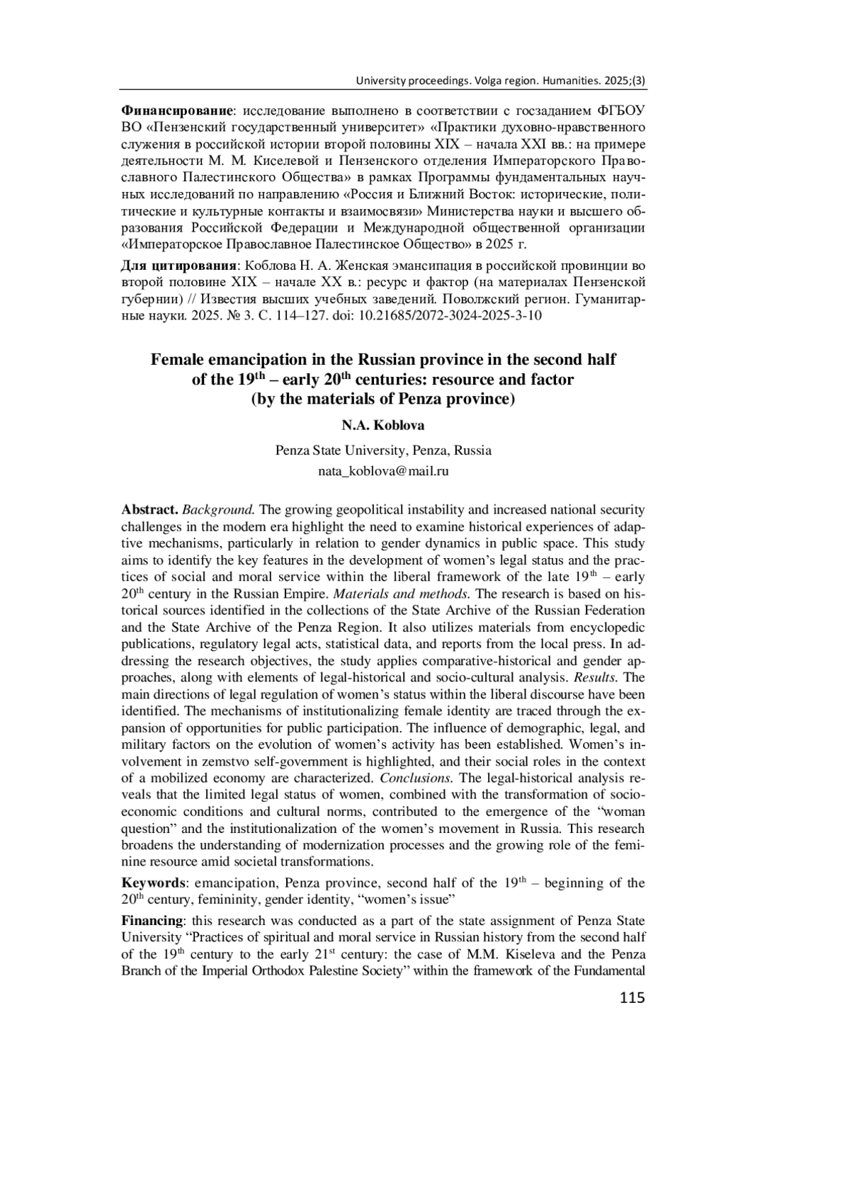 Актуальность и цели. Рост геополитической нестабильности и усиление вызовов национальной безопасности в современную эпоху актуализируют обращение к историческому опыту формирования адаптационных механизмов с учетом гендерной специфики публичного пространства. Цель исследования - выявить особенности становления правового статуса женщин и практик социального и нравственного служения в рамках либеральной модели второй половины XIX - начала XX в. в Российской империи. Материалы и методы. Исследование выполнено на основе исторических источников, выявленных в фондах Государственного архива Российской Федерации и Государственного архива Пензенской области. Использованы материалы энциклопедических изданий, нормативно-правовые акты, статистические данные, сведения местной периодической печати. При решении исследовательских задач применялись сравнительно-исторический и гендерный методы, элементы историко-правового и социокультурного анализа. Результаты. Определены основные направления правового регулирования женского статуса в контексте либерального дискурса. Прослежены механизмы институционализации женской идентичности через расширение поля потенциального участия в общественной жизни. Установлено влияние демографических, правовых и военных факторов на эволюцию женской активности. Освещено участие женщин в земском самоуправлении и охарактеризованы их социальные роли в условиях мобилизационной экономики. Выводы. Историко-правовой анализ свидетельствует о том, что ограниченность правового статуса женщин, сопряженная с трансформацией социально-экономических условий и культурных норм, стала предпосылкой формирования «женского вопроса» и институализации женского движения в России. Проведенное исследование позволяет расширить представления о модернизационных процессах и усилении фемининного ресурса в условиях общественных трансформаций.