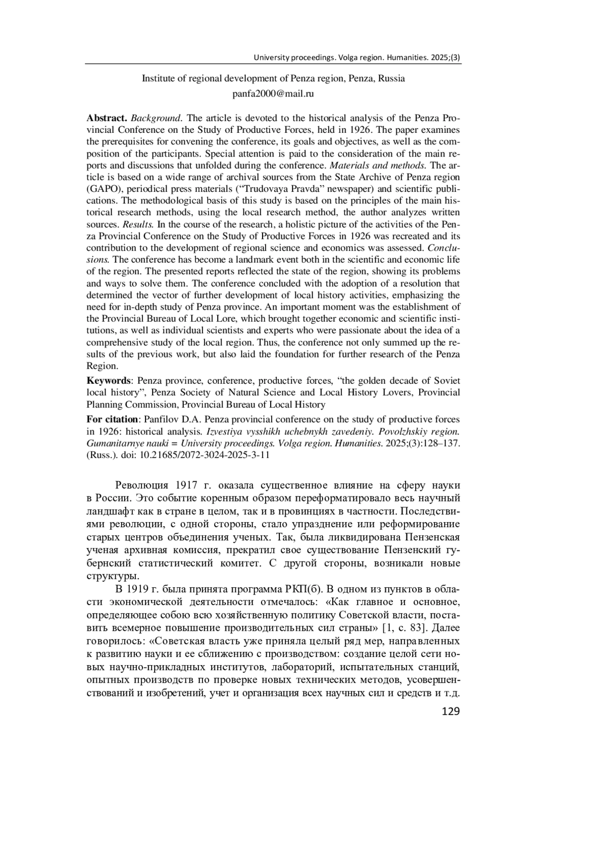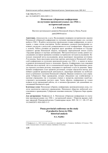Актуальность и цели. Исследование посвящено историческому анализу Пензенской губернской конференции по изучению производительных сил, состоявшейся в 1926 г. В работе исследуются предпосылки созыва конференции, ее цели и задачи, а также состав участников. Особое внимание уделяется рассмотрению основных докладов и дискуссий, развернувшихся в ходе конференции. Материалы и методы. Работа основана на широком круге архивных источников из Государственного архива Пензенской области, материалах периодической печати (газета «Трудовая правда») и научных публикациях. Методологическую основу данного исследования составили принципы основных исторических методов исследования. Используя локальный метод исследования, автор анализирует письменные источники. Результаты. Была воссоздана целостная картина деятельности Пензенской губернской конференции по изучению производительных сил 1926 г. и оценен ее вклад в развитие региональной науки и экономики. Выводы. Конференция стала знаковым событием как в научной, так и в экономической жизни края. Представленные доклады отразили состояние региона, показывая его проблемы и пути их решения. Завершением конференции стало принятие резолюции, которая определила вектор дальнейшего развития краеведческой деятельности, акцентируя внимание на необходимости углубленного изучения Пензенской губернии. Важным моментом стало учреждение Губернского бюро краеведения, которое объединяло как хозяйственные и научные учреждения, так и отдельных ученых и экспертов, увлеченных идеей всестороннего исследования местного края. Таким образом, конференция не только подвела итоги предыдущей работы, но и заложила фундамент для дальнейших исследований Пензенского края.
