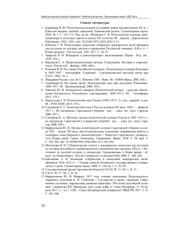 12. Варфоломеев Ю. В. Органы политической полиции Саратовской губернии в конце XIX - начале XX века: институциональные изменения, направления работы и специфика межгубернского взаимодействия // Известия Саратовского университета. Новая серия. Серия: Экономика. Управление. Право. 2024. Т. 24, вып. 2. С. 192-202. DOI: 10.18500/1994-2540-2024-24-2-192-202