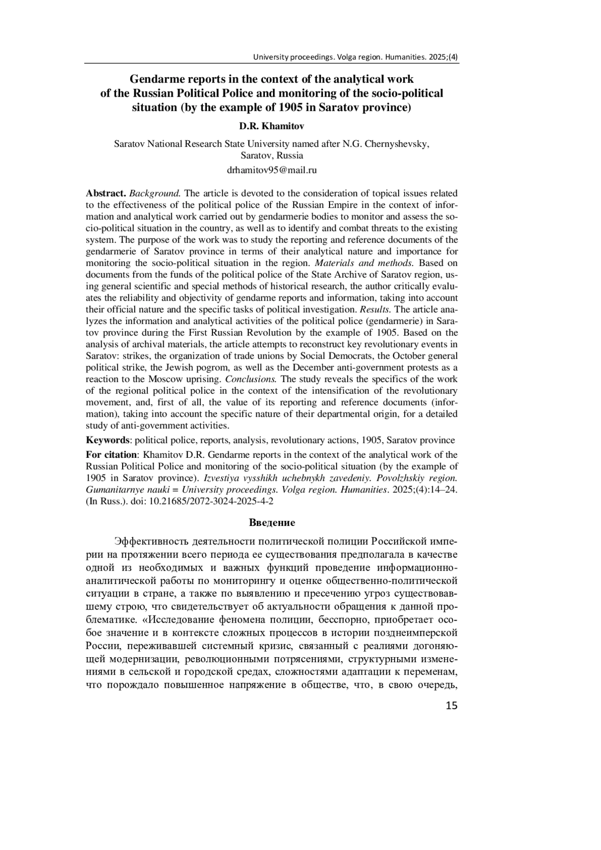 Актуальность и цели. Работа посвящена рассмотрению актуальных вопросов, связанных с эффективностью деятельности политической полиции Российской империи в контексте проведения жандармскими органами информационно-аналитической работы по мониторингу и оценке общественно-политической ситуации в стране, а также по выявлению и пресечению угроз существовавшему строю. Целью исследования стало изучение отчетных и информационно-справочных документов жандармерии Саратовской губернии с точки зрения их аналитического характера и важности для мониторинга общественно-политической ситуации в регионе. Материалы и методы. Основываясь на документах из фондов политической полиции Государственного архива Саратовской области, применяя общенаучные и специальные методы исторического исследования, автор критически оценивает достоверность и объективность жандармских донесений и сведений, учитывая их служебный характер и специфические задачи политического сыска. Результаты. Проанализирована информационно-аналитическая деятельность органов политической полиции (жандармерии) в Саратовской губернии в период Первой российской революции на примере 1905 г. На основе анализа архивных материалов предпринята реконструкция ключевых революционных событий в Саратове: забастовок, организации социал-демократами профсоюзов, Октябрьской всеобщей политической стачки, еврейского погрома, а также декабрьских антиправительственных выступлений как реакции на московское восстание. Выводы. Исследование выявляет особенности работы региональной политической полиции в условиях активизации революционного движения, и в первую очередь ценность ее отчетных и справочно-информационных документов (сведений), с учетом специфичного характера их ведомственного происхождения, для детального изучения антиправительственной деятельности.