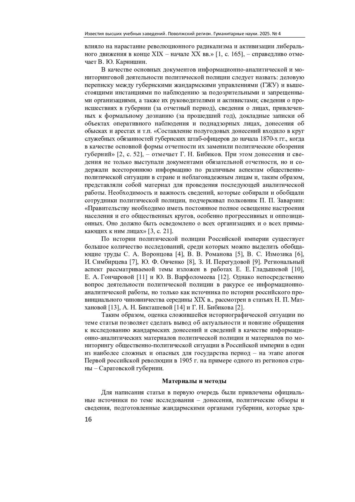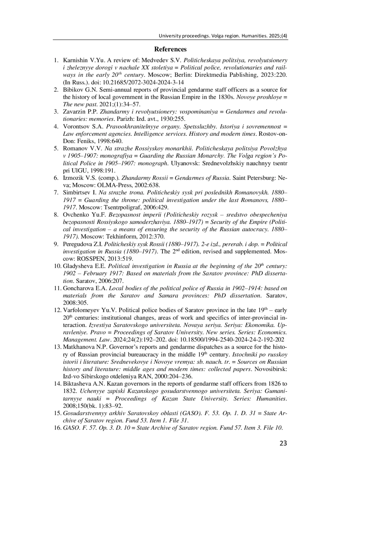 1. Карнишин В. Ю. Политическая полиция в условиях новых вызовов начала ХХ в. // Известия высших учебных заведений. Поволжский регион. Гуманитарные науки. 2024. № 3. С. 165-172. Рец. на кн.: Медведев С. В. Политическая полиция, революционеры и железные дороги в начале XX столетия. М.; Берлин: Директмедиа Паблишинг, 2023. 220 с. DOI: 10.21685/2072-3024-2024-3-14