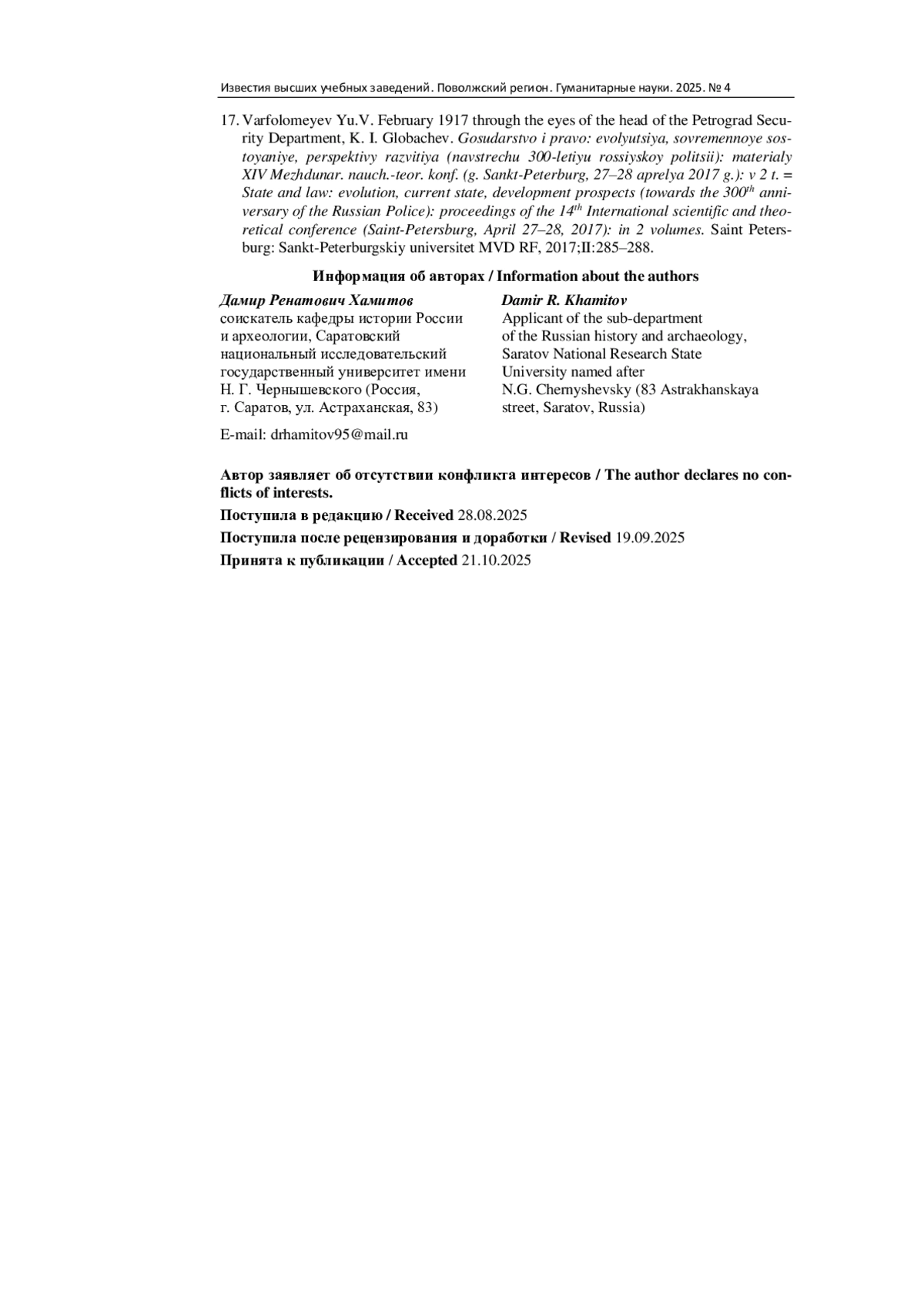 17. Варфоломеев Ю. В. Февраль 1917 года глазами начальника Петроградского охранного отделения К. И. Глобачева // Государство и право: эволюция, современное состояние, перспективы развития (навстречу 300-летию российской полиции): материалы XIV Междунар. науч.-теор. конф. (г. Санкт-Петербург, 27-28 апреля 2017 г.): в 2 т. СПб.: Санкт-Петербургский университет МВД РФ, 2017. Т. II. С. 285-288.