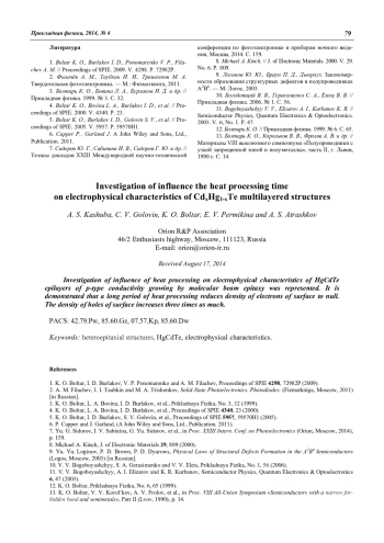 A. S. Kashuba, C. V. Golovin, K. O. Boltar, E. V. Permikina and A. S. Atrashkov Investigation of influence the heat processing time on electrophysical characteristics of CdхHg1-хTe multilayered structures 76