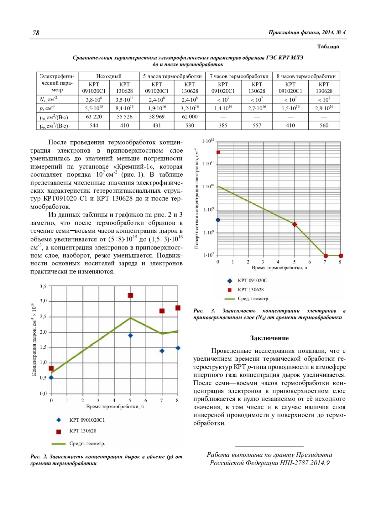 Проведенные исследования показали, что с увеличением времени термической обработки гетероструктур КРТ р-типа проводимости в атмосфере инертного газа концентрация дырок увеличивается. После семи—восьми часов термообработки концентрация электронов в приповерхностном слое приближается к нулю независимо от её исходного значения, в том числе и в случае наличия слоя инверсной проводимости у поверхности до термообработки.