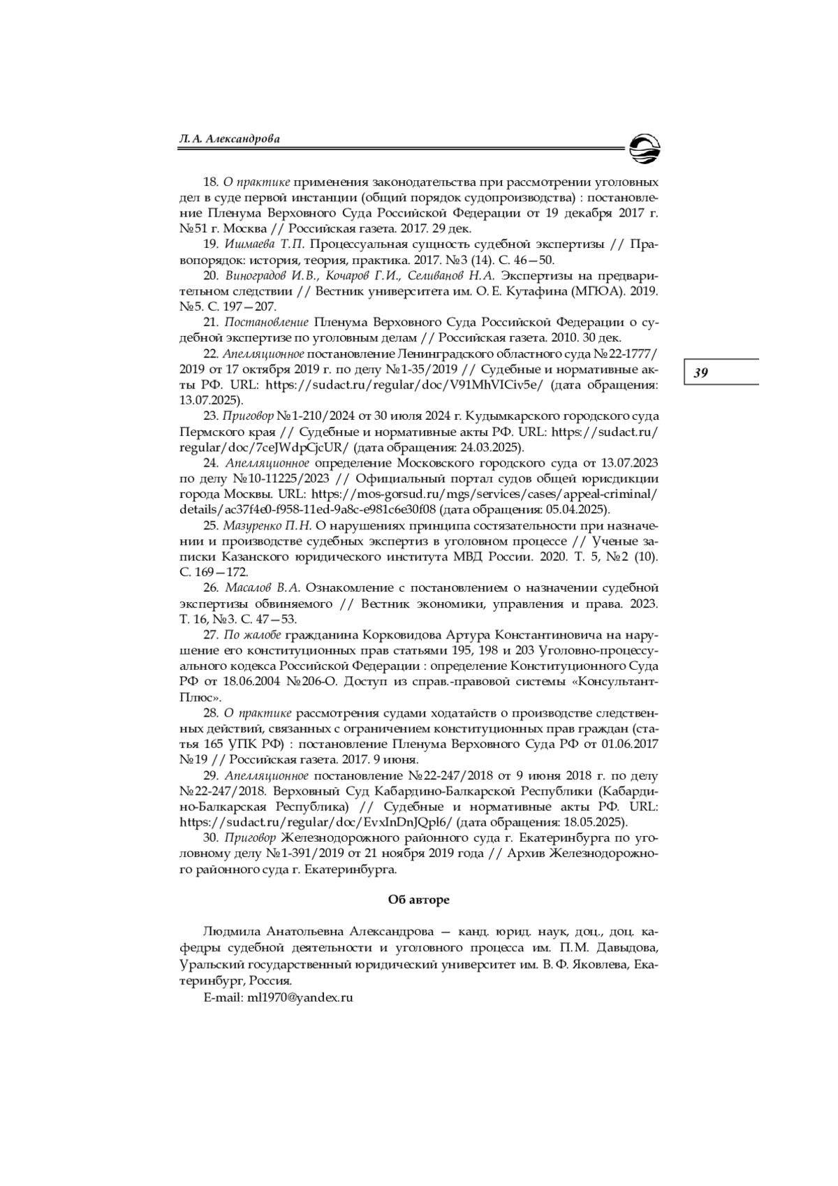 25. Мазуренко П. Н. О нарушениях принципа состязательности при назначении и производстве судебных экспертиз в уголовном процессе // Ученые записки Казанского юридического института МВД России. 2020. Т. 5, № 2 (10). С. 169-172. EDN: TXAAHA