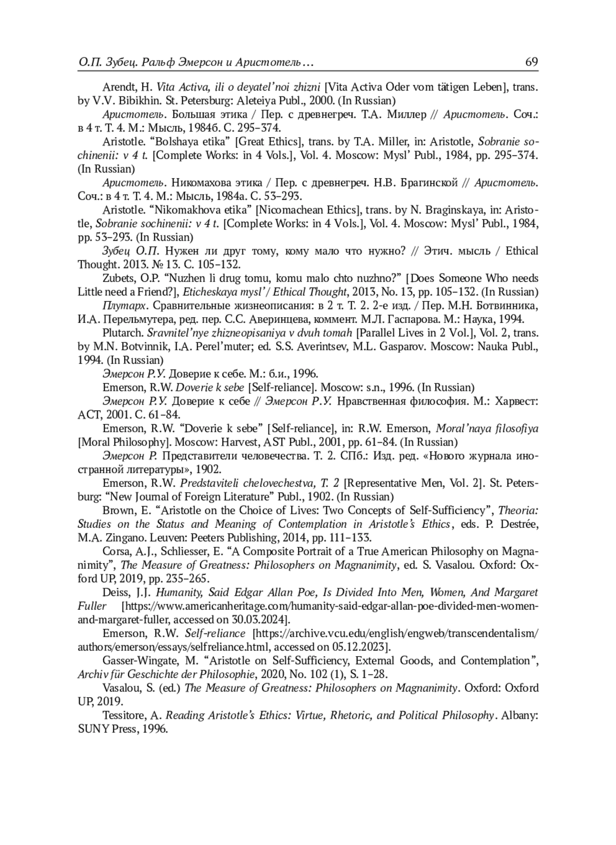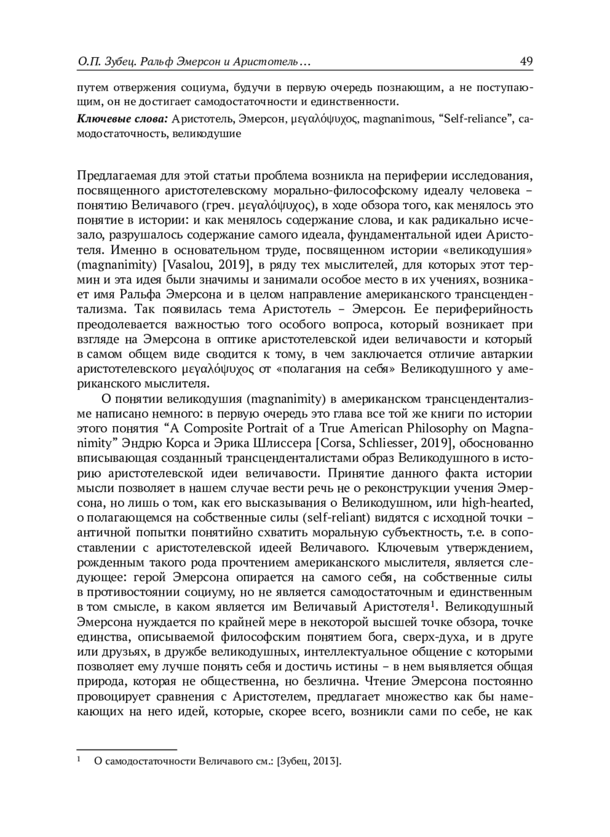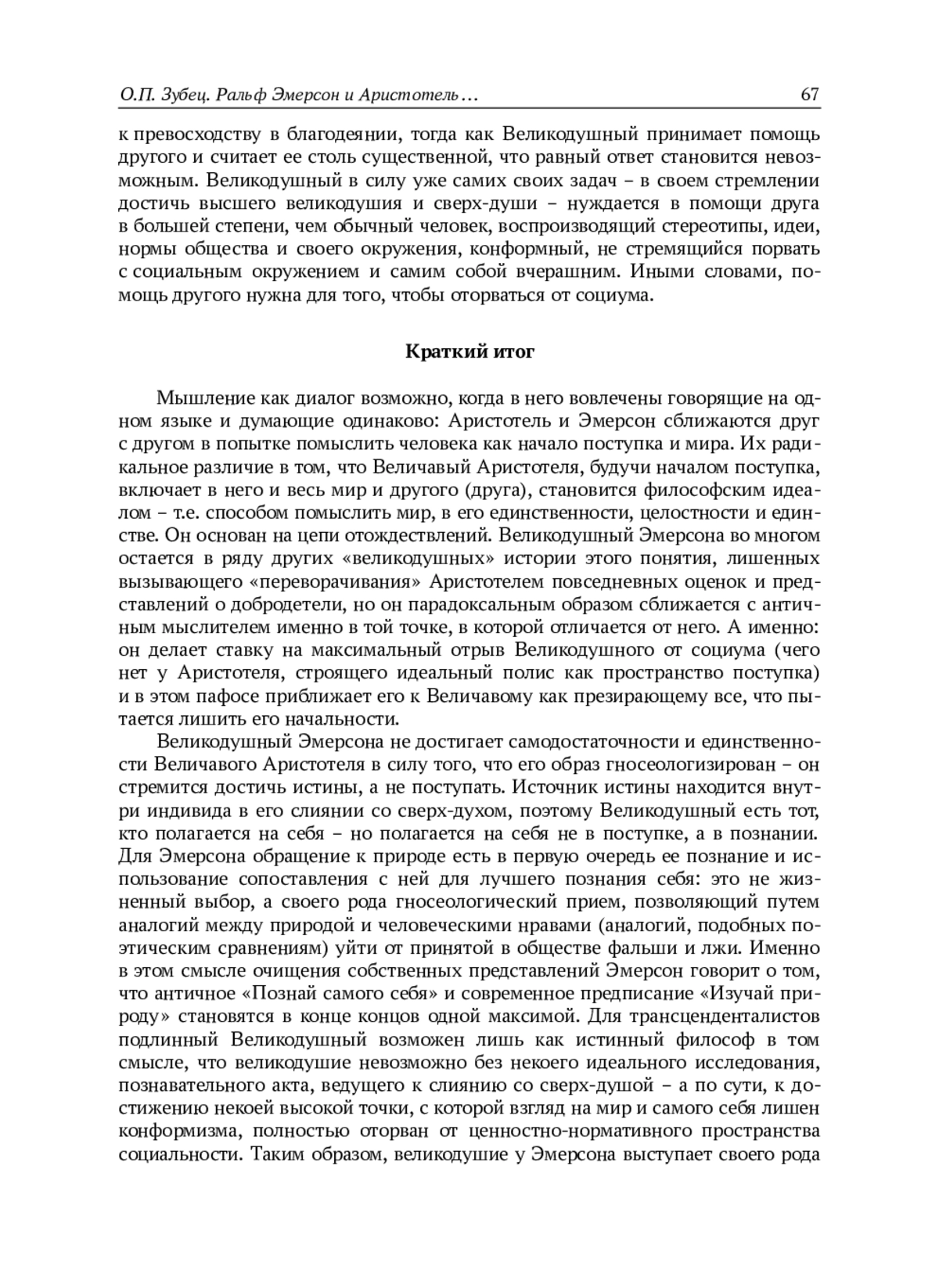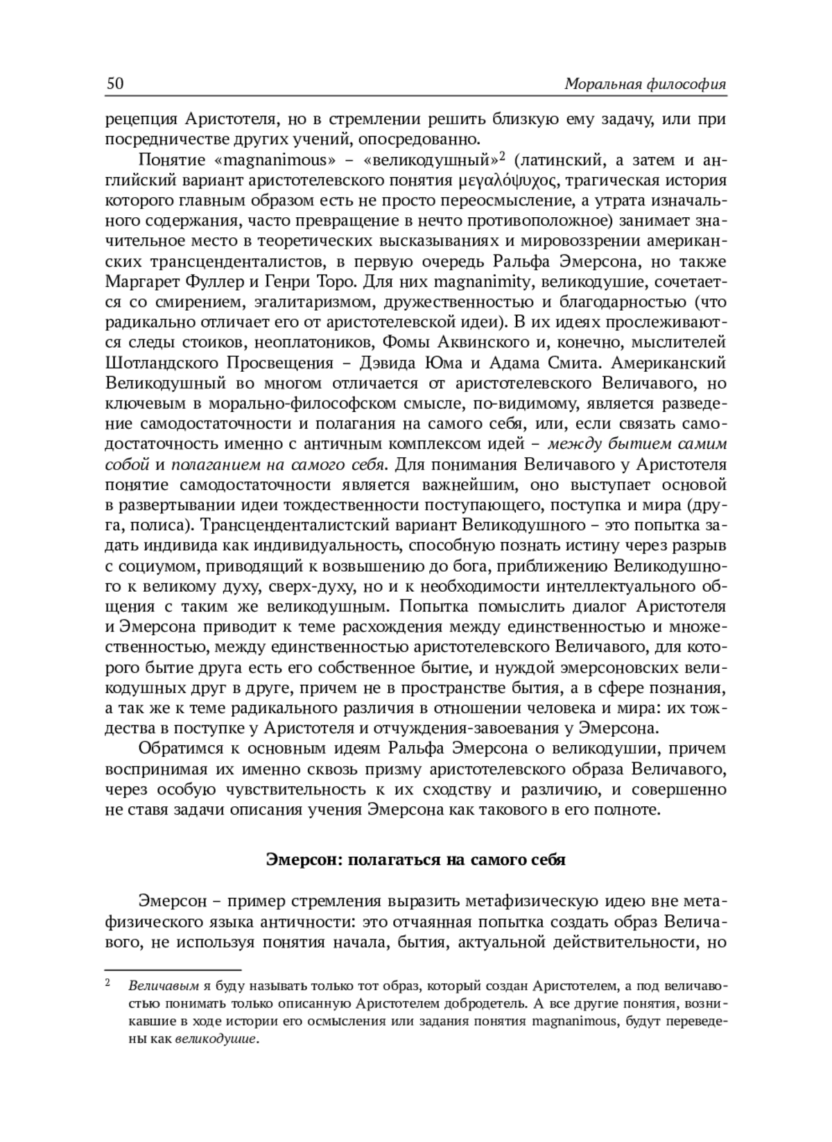 История аристотелевского понятия μεγαλόψυχος (Величавый) простирается на почти два с половиной тысячелетия и является историей утраты собственно аристотелевского понятия. Ральф Эмерсон принадлежит к тем мыслителям, во взглядах которых понятие великодушия является не случайным и значимым. В статье предлагается увидеть его в первую очередь в непосредственном соотнесении с образом Величавого у Аристотеля. Главным источником при обращении к Великодушному Эмерсона является его известное эссе “Self-reliance”. Оно пронизано стремлением освободить человека от конформизма, подражательства навязываемым социумом представлениям, нормам, оценкам, от самого взгляда на них и того, как он видится со стороны. Это освобождение позволяет человеку положиться на самого себя и возвыситься до сверх-духа, узреть таким образом истину, в первую очередь – о самом себе. Это стремление Эмерсона роднит его с аристотелевской попыткой последовательно помыслить человека как начало поступка и мира, в результате которой и рождается образ Величавого, это родство проявляется в перекличке многих тем и идей. Так, Эмерсон стремится освободить человека не только от социума, но и от его собственного прошлого и будущего, т. е. помыслить его в актуальном настоящем, вне времени, что перекликается с аристотелевским пониманием поступка как актуальной действительности, как целого и самодостаточного. Не соглашаясь с противопоставлением Аристотеля и Эмерсона на основе понимания ими роли внешних благ или сведения его к отдельным суждениям, автор видит ключевое отличие в следующем: Величавый задает своим решением-поступком мир людей, полис, он самодостаточен и единственен, тогда как Великодушный стремится опереться на себя путем отвержения социума, будучи в первую очередь познающим, а не поступающим, он не достигает самодостаточности и единственности.