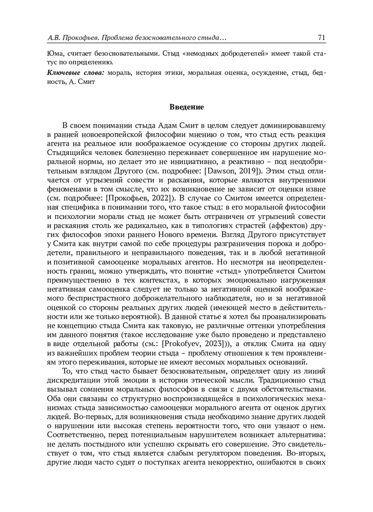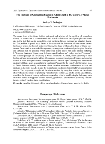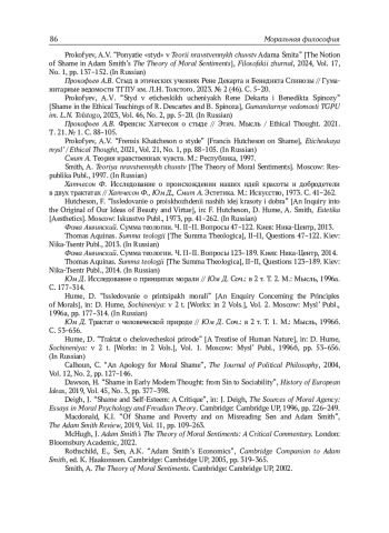 7. Прокофьев А.В. Понятие “стыд” в “Теории нравственных чувств” Адама Смита // Фи-лософский журнал. 2024. Т. 17. № 1. C. 137-152.