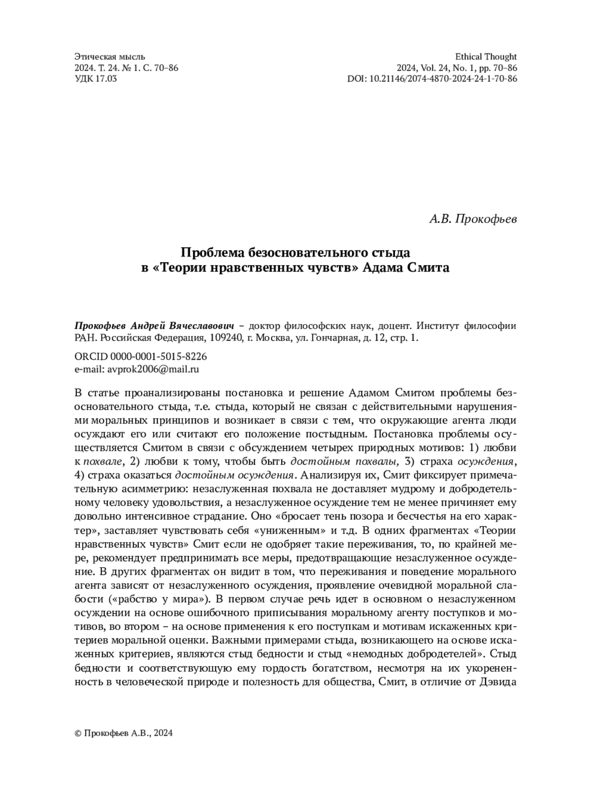 8. Prokofyev, A.V. “Ponyatie “styd” v Teorii nravstvennykh chuvstv Adama Smita” [The Notion of Shame in Adam Smith’s The Theory of Moral Sentiments], Filosofskii zhurnal, 2024, Vol. 17, No. 1, pp. 137-152. (In Russian). EDN: NOUCZT