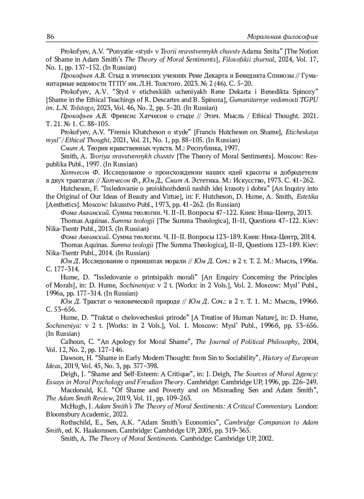 12. Prokofyev, A.V. “Frensis Khatcheson o styde” [Francis Hutcheson on Shame], Eticheskaya mysl’ / Ethical Thought, 2021, Vol. 21, No. 1, pp. 88-105. (In Russian).