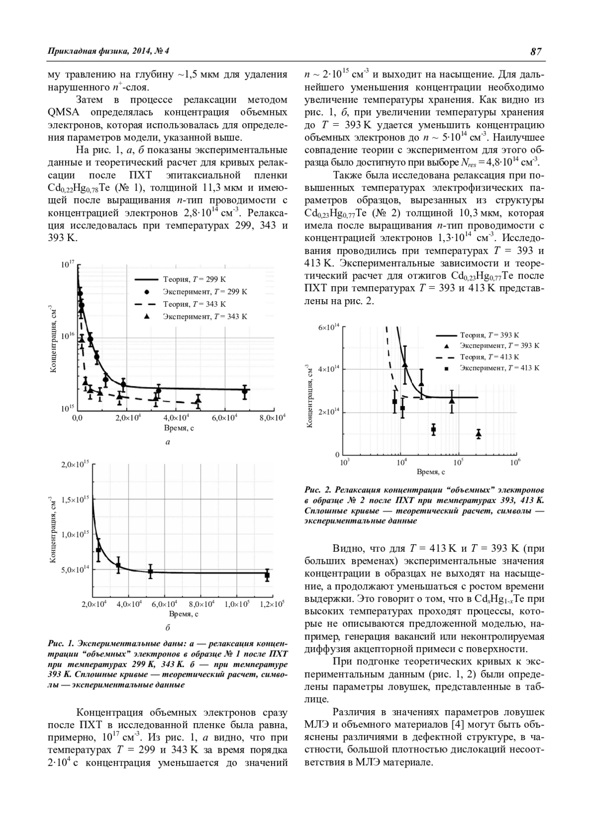 Также было установлено, что после ПХТ образцов CdxHg1-xTe c x ~ 0,2, происходит релаксация электрофизических параметров в рабочем слое, ускоряющаяся с увеличением температуры. Эффект релаксации описывается моделью, основанной на распаде донорных комплексов, образующихся между междоузельными атомами ртути и структурными дефектами кристалла (ловушками двух типов).
