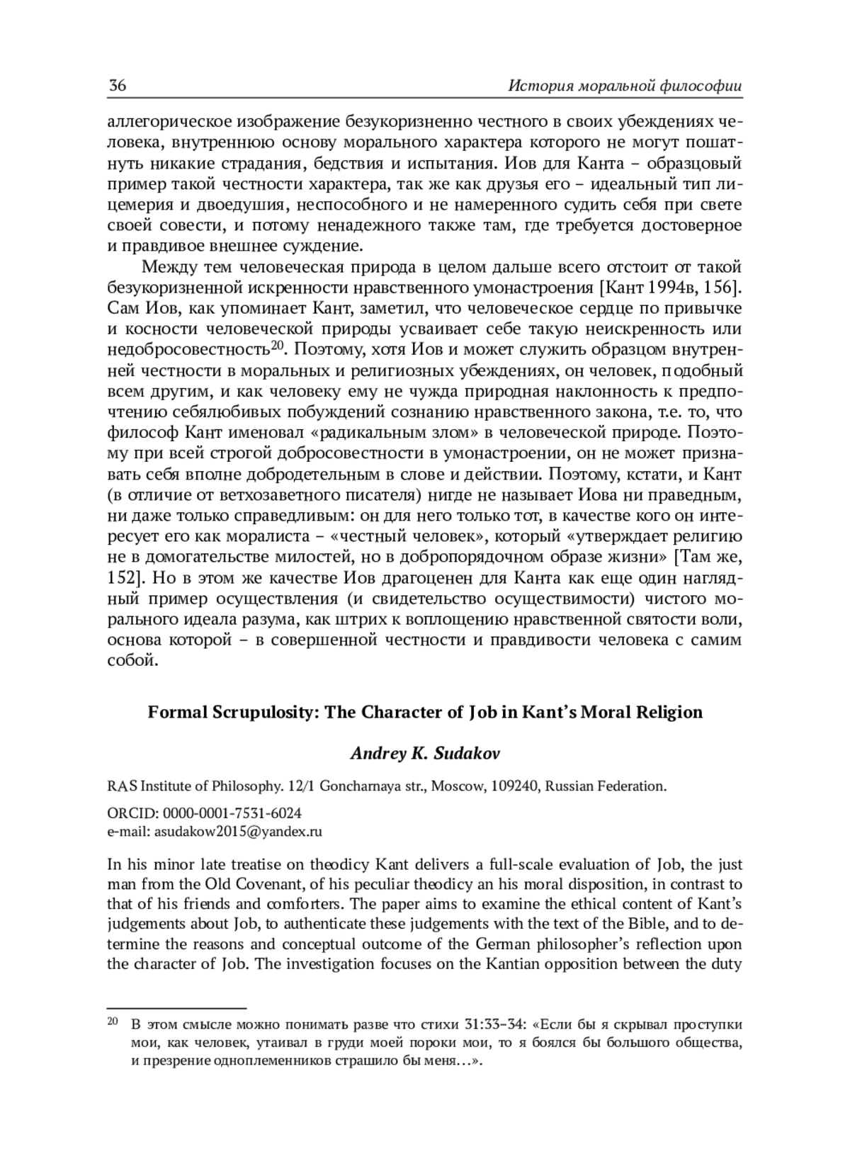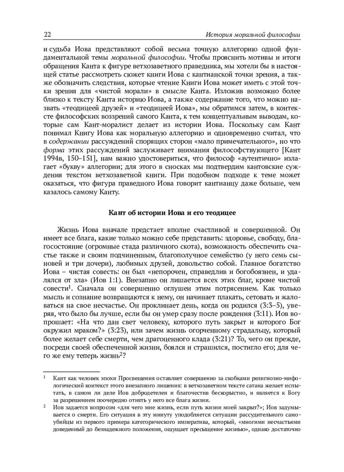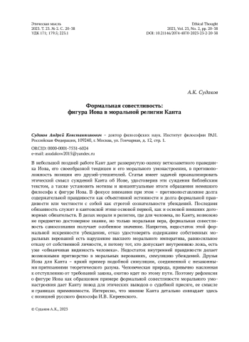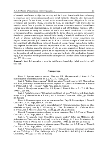 В небольшой поздней работе Кант дает развернутую оценку ветхозаветного праведника Иова, его своеобразной теодицеи и его морального умонастроения, в противоположность позиции его друзей-утешителей. Статья имеет задачей проанализировать этический смысл суждений Канта об Иове, удостоверив эти суждения библейским текстом, а также установить мотивы и концептуальные итоги обращения немецкого философа к фигуре Иова. В фокусе внимания при этом – противопоставление долга содержательной правдивости как объективной истинности и долга формальной правдивости или честности с собой как строгой сознательности убеждений. Последняя обязанность служит в кантовской этике основой первой, как и основой внешних договорных обязательств. В делах морали и религии, где для человека, по Канту, возможно не предметно достоверное знание, но только моральная вера, формальная совестливость самосознания получает особенное значение. Напротив, недостаток этой формальной искренности убеждения, отказ удостоверять содержание собственных моральных верований есть нарушение высшего морального императива, равносильное отказу от собственной личности, и потому тот, кто допускает внутреннюю ложь, есть уже «обманчивая видимость человека». Недостаток внутренней правдивости делает возможными притворство в моральных верованиях, симуляцию убеждений. Друзья Иова для Канта – яркий пример подобной симуляции, соединенной с незаконными притязаниями теоретического разума. Человеческая природа, привычно наклонная к отступлению от требований закона, охотно идет по этому пути. Поэтому рефлексия о фигуре Иова как образцовом примере формальной совестливости морального умонастроения дает Канту повод для этических выводов о судебной присяге, ее смысле и границах применимости. Интересно, что мнение Канта детально совпадает здесь с позицией русского философа И. В. Киреевского.