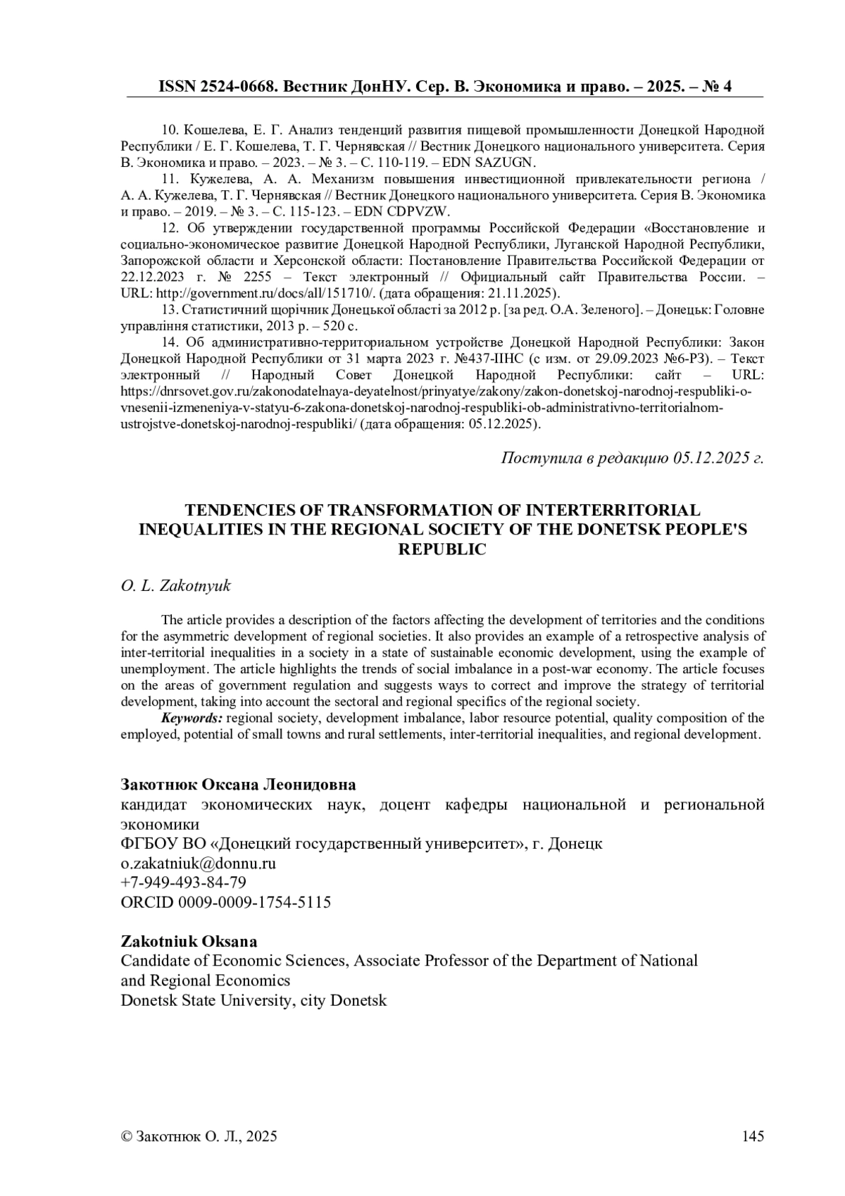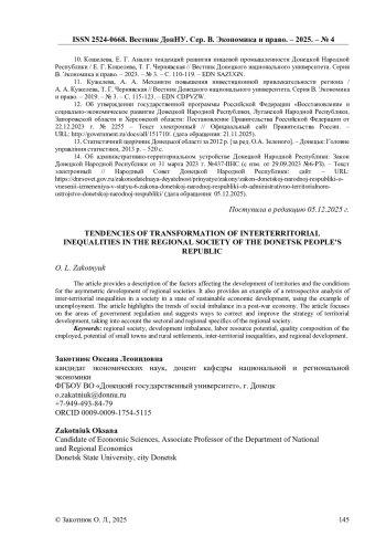 7. Василенко, В. Н. Метаморфозы административно-территориального устройства в границах современной Донецкой Народной Республики / В.Н. Василенко, Д.В. Василенко // Вестник Кемеровского государственного университета. Серия: Политические, социологические и экономические науки. 2024. №. 2. С. 284-294. 10.21603/2500-3372-2024-9-2-284-294 (дата обращения: 01.12.2025). DOI: 10.21603/2500-3372-2024-9-2-284-294( EDN: MUAVYI