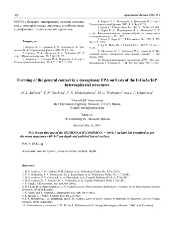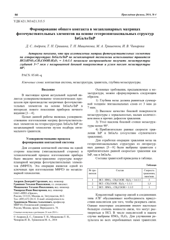 D. S. Andreev, T. N. Grishina, T. N. Mishchenkova, M. A. Trishenkov and I. V. Chinareva Forming of the general contact in a mesaplanar FPA on basis of the InGaAs/InP heteroepitaxial structures 90
