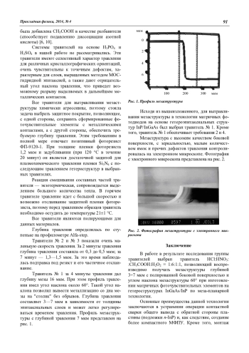 В работе в результате исследования группы травителей выбран травитель HCl: HNO3:: CH3COOH: H2O2 = 1:6:1:1, позволяющий воспроизводимо получать мезаструктуры глубиной 3÷7 мкм с полированной боковой поверхностью и углом наклона мезаструктуры 60° при изготовлении матричных фоточувствительных элементов на гетероструктурах InGaAs/InP по меза-планарной технологии.