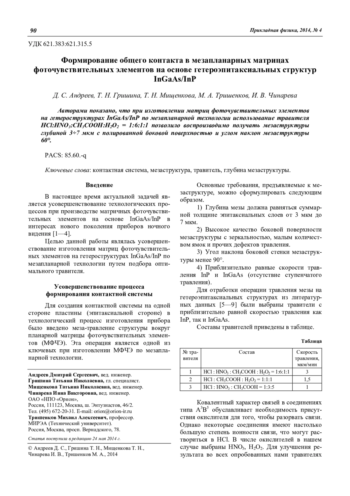 Авторами показано, что при изготовлении матриц фоточувствительных элементов на гетероструктурах InGaAs/InP по мезапланарной технологии использование травителя HCl: HNO3: CH3COOH: H2O2 = 1:6:1:1 позволило воспроизводимо получать мезаструктуры глубиной 3÷7 мкм с полированной боковой поверхностью и углом наклон мезаструктуры 60°.