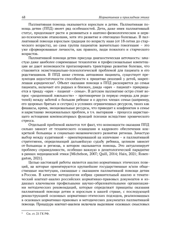 Паллиативная помощь детям – особая междисциплинарная отрасль медицины, в которой встречаются специфические этические проблемы, отличные от общемедицинских. В статье проведена реконструкция основных нормативно-этических позиций, декларируемых паллиативными институциями и органами власти России и регулирующих оказание паллиативной помощи детям (в сравнении с помощью взрослым). Представлен качественный контент-анализ и сравнительный анализ российских нормативных документов и научно-методических материалов, регулирующих оказание паллиативной помощи детям. Также проведено сравнение с документами, которые регулируют (как директивно, так и рекомендательно) оказание паллиативной помощи детям в сравнении с паллиативной медицинской помощью взрослым. Установлено, что этически значимые биомедицинские особенности паллиативных состояний у детей, в сравнении со взрослыми, находят отражение в структуре нормативно-этической регуляции паллиативной помощи детям, особенно в рамках широко применяемого в ней деонтологического подхода, и в несколько меньшей степени – в рамках этики добродетели. Вместе с тем показано, что консеквенциалистский подход мало «чувствителен» к такой специфике и достаточно универсален.