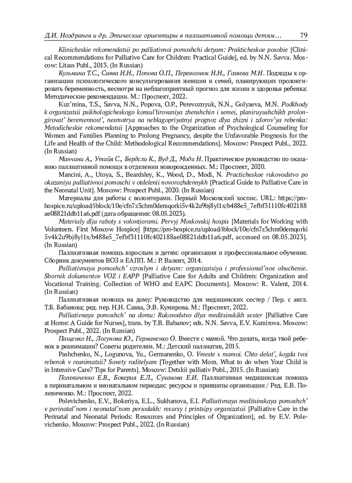 25. Полевиченко Е.В., Бокерия Е.Л., Суханова Е.И. Паллиативная медицинская помощь в перинатальном и неонатальном периодах: ресурсы и принципы организации / Pед. Е.В. Полевиченко. М.: Проспект, 2022.