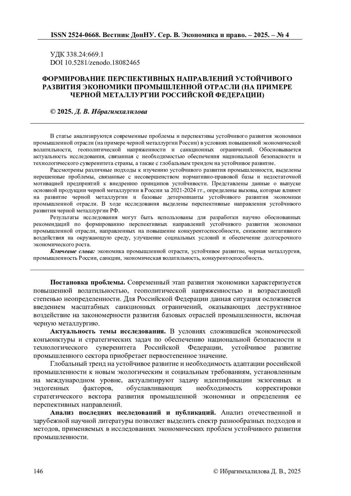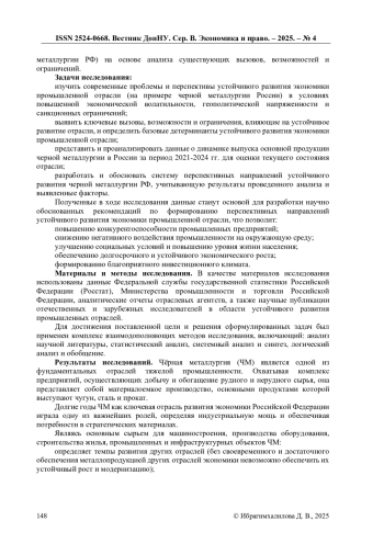 В статье анализируются современные проблемы и перспективы устойчивого развития экономики промышленной отрасли (на примере черной металлургии России) в условиях повышенной экономической волатильности, геополитической напряженности и санкционных ограничений. Обосновывается актуальность исследования, связанная с необходимостью обеспечения национальной безопасности и технологического суверенитета страны, а также с глобальным трендом на устойчивое развитие. Рассмотрены различные подходы к изучению устойчивого развития промышленности, выделены нерешенные проблемы, связанные с несовершенством нормативно-правовой базы и недостаточной мотивацией предприятий к внедрению принципов устойчивости. Представлены данные о выпуске основной продукции черной металлургии в России за 2021-2024 гг., определены вызовы, которые влияют на развитие черной металлургии и базовые детерминанты устойчивого развития экономики промышленной отрасли. В ходе исследования выделены перспективные направления устойчивого развития черной металлургии РФ. Результаты исследования могут быть использованы для разработки научно обоснованных рекомендаций по формированию перспективных направлений устойчивого развития экономики промышленной отрасли, направленных на повышение конкурентоспособности, снижение негативного воздействия на окружающую среду, улучшение социальных условий и обеспечение долгосрочного экономического роста.