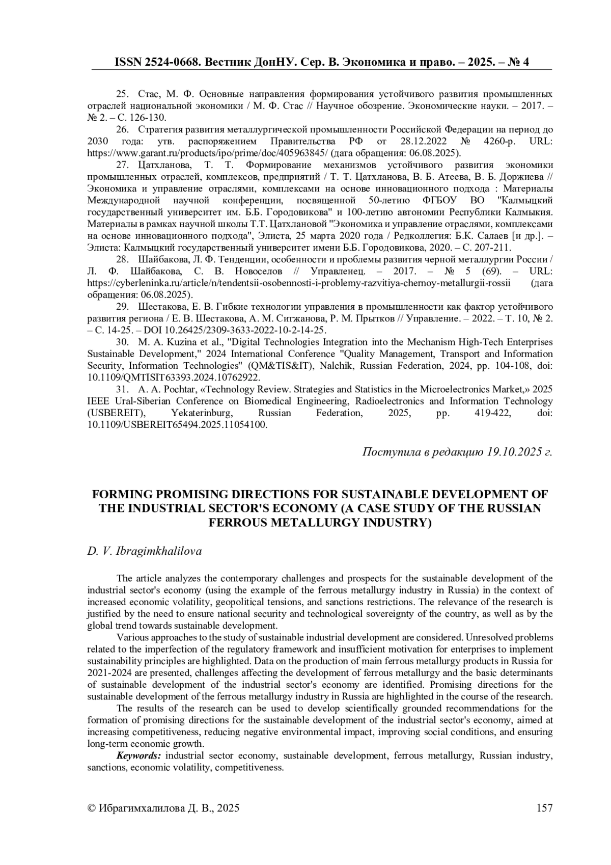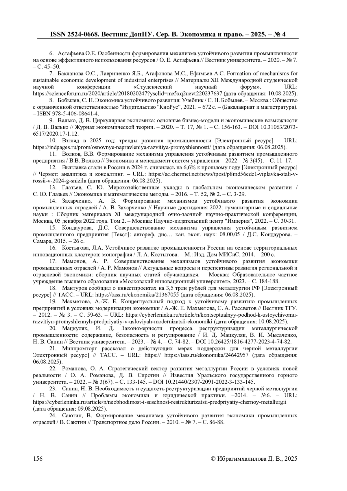 7. Бакланова О.С., Лавриненко Я.Б., Агафонова М.С., Ефимьев А.С. Formation of mechanisms for sustainable economic development of industrial enterprises // Материалы XII Международной студенческой научной конференции “Студенческий научный форум”. URL: https://scienceforum.ru/2020/article/2018020247?ysclid=me5xq2uevt220237637 (дата обращения: 10.08.2025).