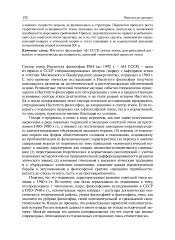 Сектор этики Института философии РАН (до 1992 г. – АН СССР) – один из первых в СССР специализированных центров (наряду с кафедрами этики и эстетики Московского и Ленинградского университетов), созданных в 1960 г. С того времени этические исследования в Институте философии получили возможность развития на систематической и институционально обеспеченной основе. Релевантные этической тематике научные события спорадически происходили в Институте философии или опосредованно с ним и в предшествующие основанию сектора этики десятилетия, и на этапе ранней истории Института. Да и после возникновения этого сектора этические исследования проводились сотрудниками Института философии, не входившими в сектор этики. Если говорить о подлинных прорывах как в философской этике, так и в нормативной, то они, скорее, произошли именно благодаря их усилиям.