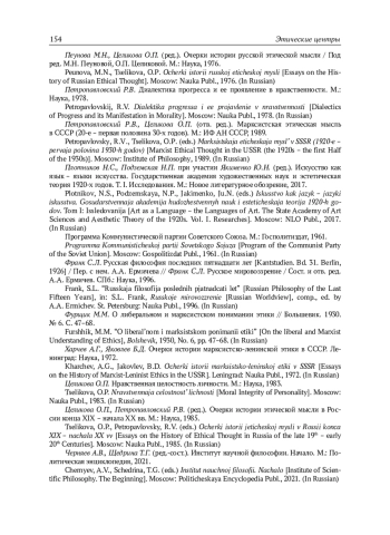 112. Tselikova, O.P., Petropavlovsky, R.V. (eds.) Ocherki istorii jeticheskoj mysli v Rossii konca XIX - nachala XX vv [Essays on the History of Ethical Thought in Russia of the late 19th - early 20th Centuries]. Moscow: Nauka Publ., 1985. (In Russian).