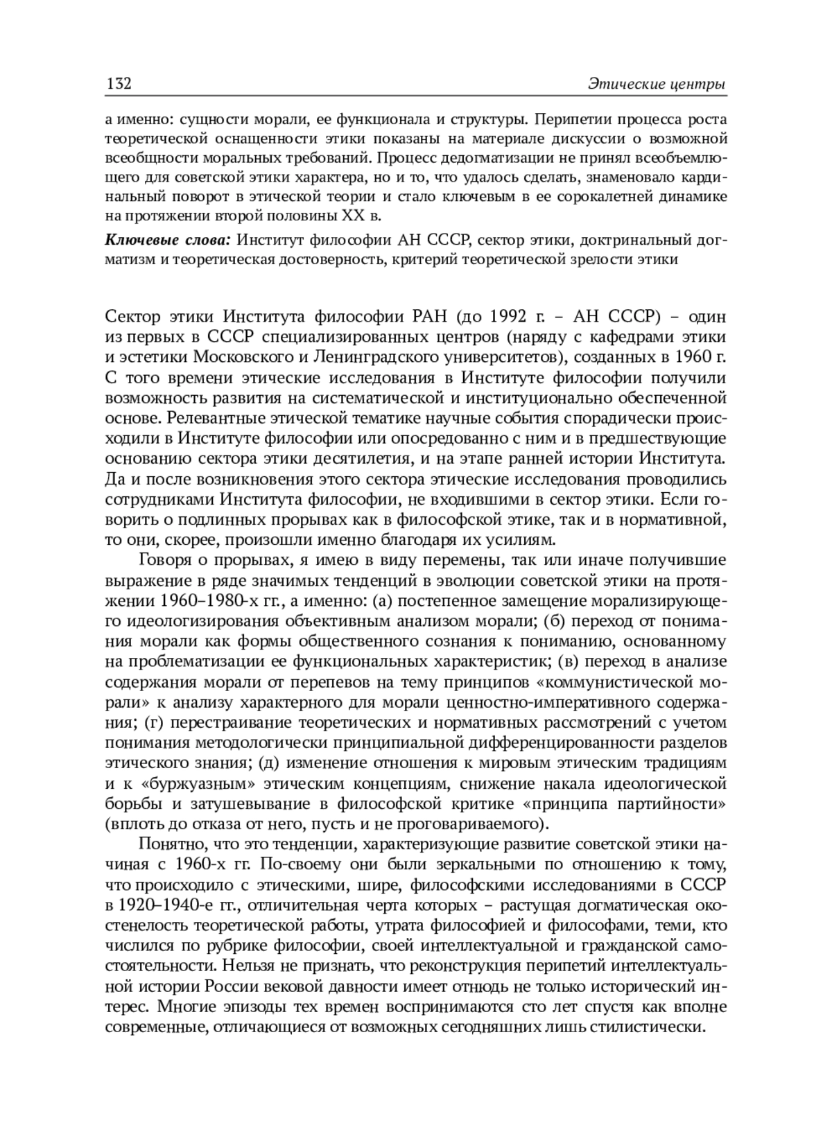 В статье в жанре аналитического описания представлены основные этапы, направления, ключевые события и деятели этических исследований в Институте философии АН СССР. Обозрение начинается с обращения к научным установкам и ожиданиям Института научной философии (ИНФ). В силу крайне неблагоприятной политической ситуации они не были реализованы, но их реконструкция представляет интерес для понимания того исследовательского потенциала, который был у ИНФ и который был отчасти осуществлен философами, побывавшими несколько месяцев сотрудниками ИНФ, после их высылки из Советской России. Оказавшись в ИНФ наедине с собой, философы-марксисты довольно скоро оказались втянутыми в острые идеологические дрязги, которые по сути не оставили места для философии в собственном смысле слова. После дебатов конца 1920-х – начала 1930-х гг., Институт философии АН СССР (ИФАН) возвращается к этическим проблемам лишь двадцать лет спустя. В статье представлены некоторые эпизоды ранней истории этических разработок в ИФАН, которые долгое время оставались в забвении. В статье признается, что теоретически значимым в развитии этических исследований в ИФАН, так же, как и в советской этике в целом было все то, что способствовало их дедогматизации и выработке теоретической достоверности, которая в конечном счете задавалась внутренней совместимостью базовых определений, а именно: сущности морали, ее функционала и структуры. Перипетии процесса роста теоретической оснащенности этики показаны на материале дискуссии о возможной всеобщности моральных требований. Процесс дедогматизации не принял всеобъемлющего для советской этики характера, но и то, что удалось сделать, знаменовало кардинальный поворот в этической теории и стало ключевым в ее сорокалетней динамике на протяжении второй половины ХХ в.