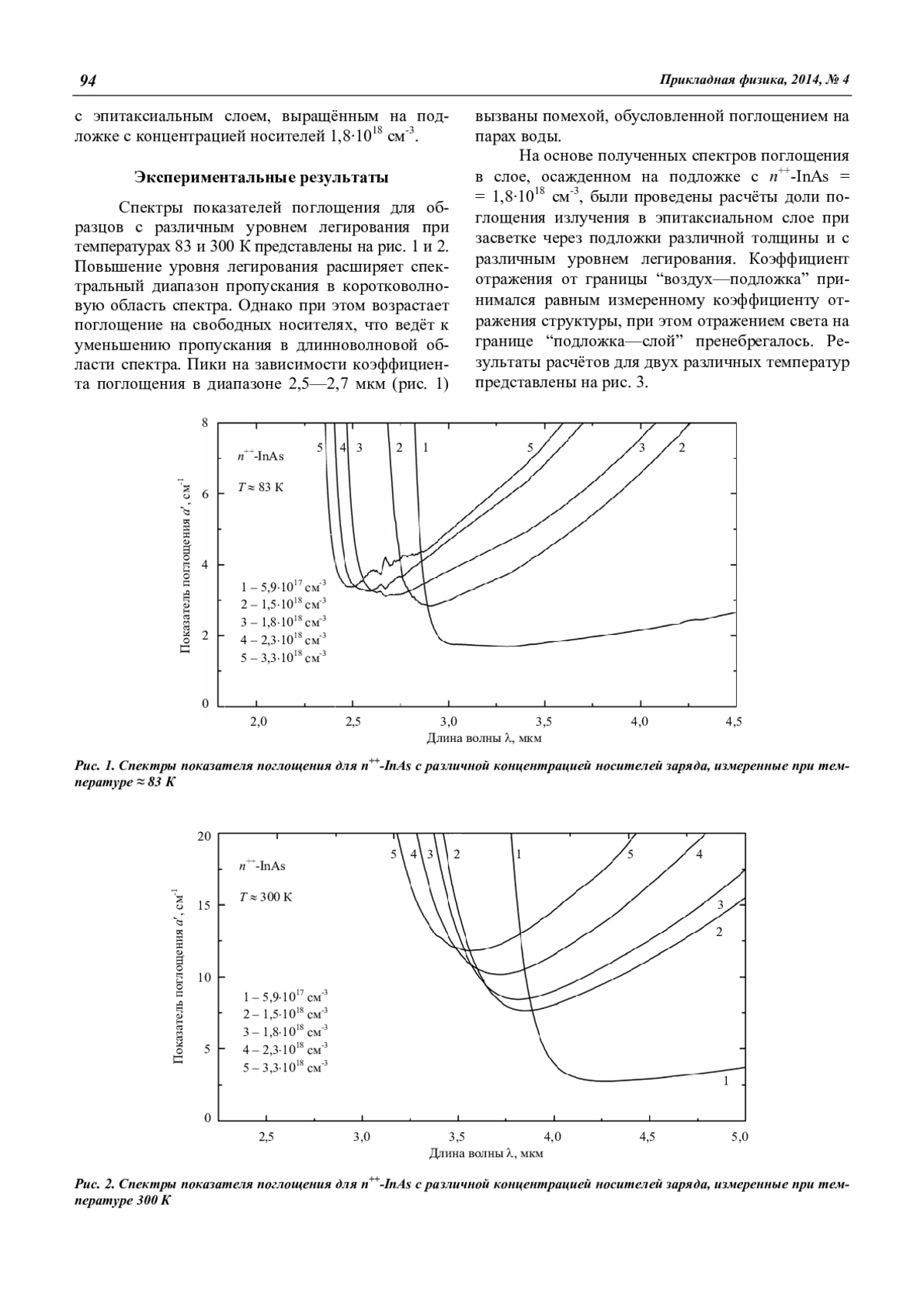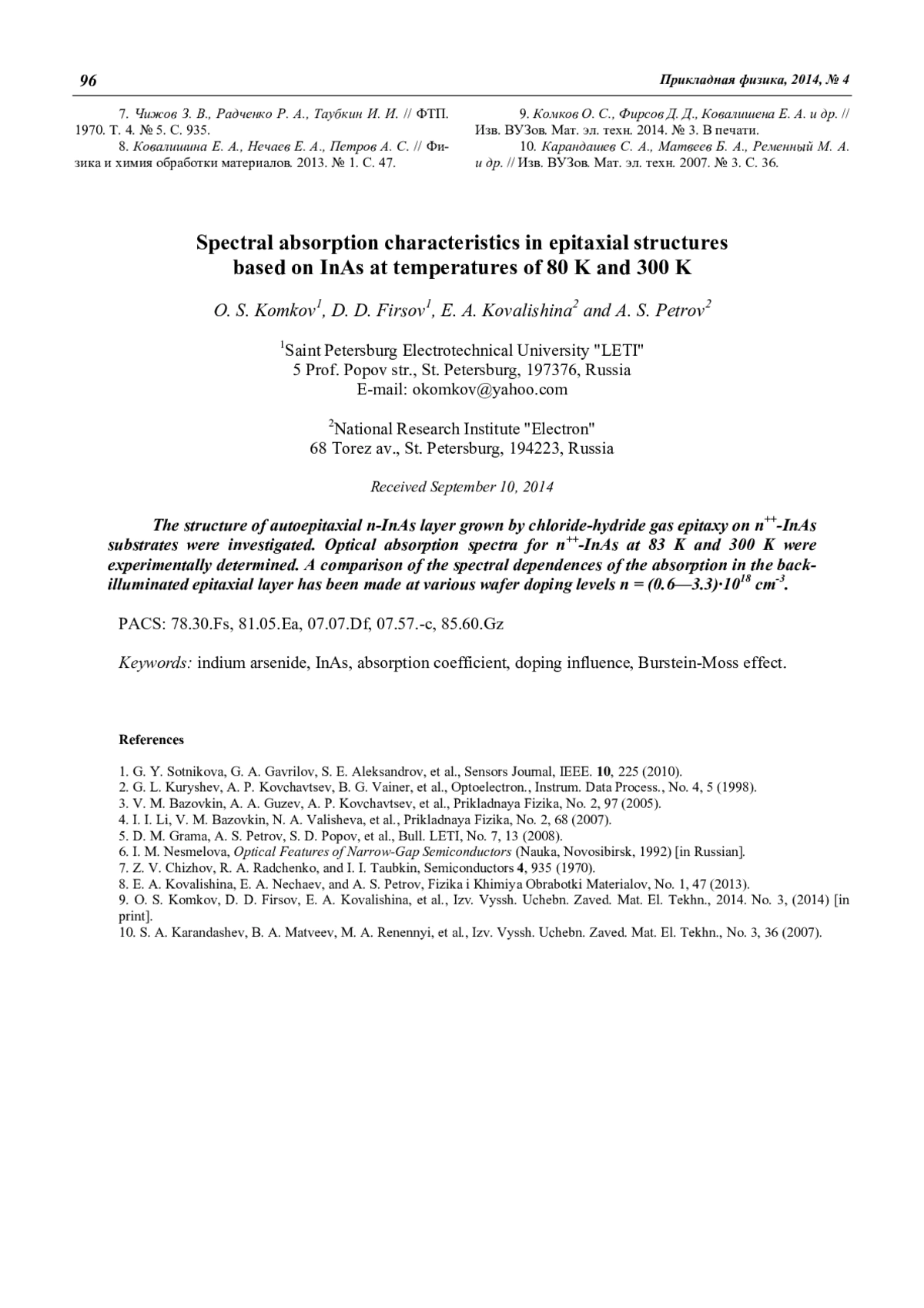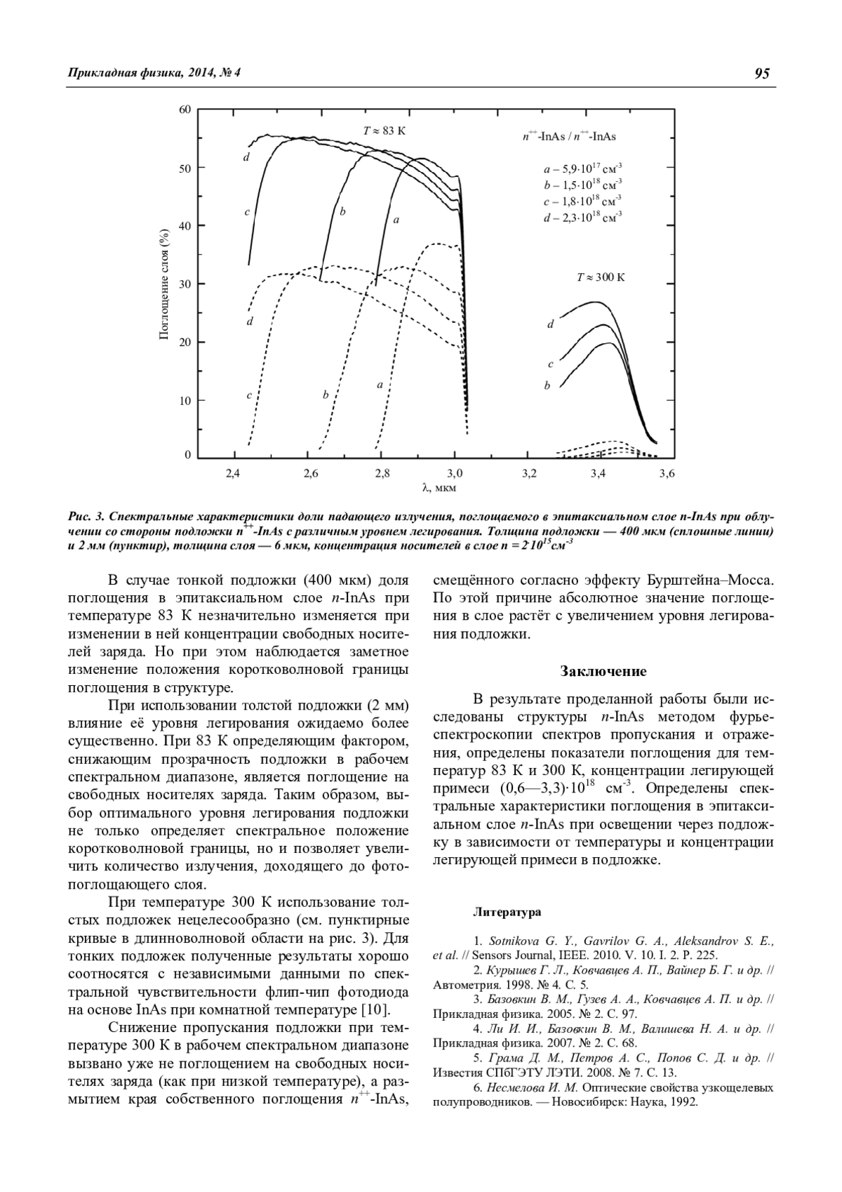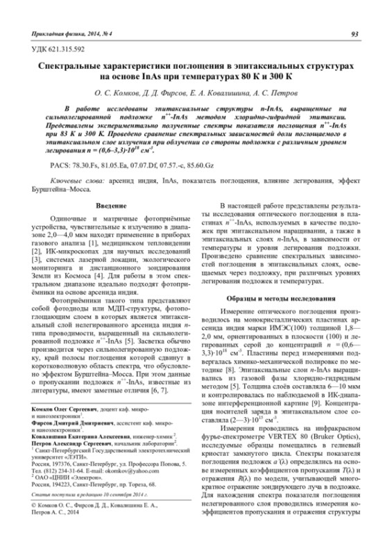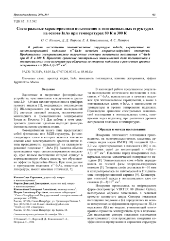 Комков О. С., Фирсов Д. Д., Ковалишина Е. А., Петров А. С. Спектральные характеристики поглощения в эпитаксиальных структурах на основе InAs при температурах 80 К и 300 К 93