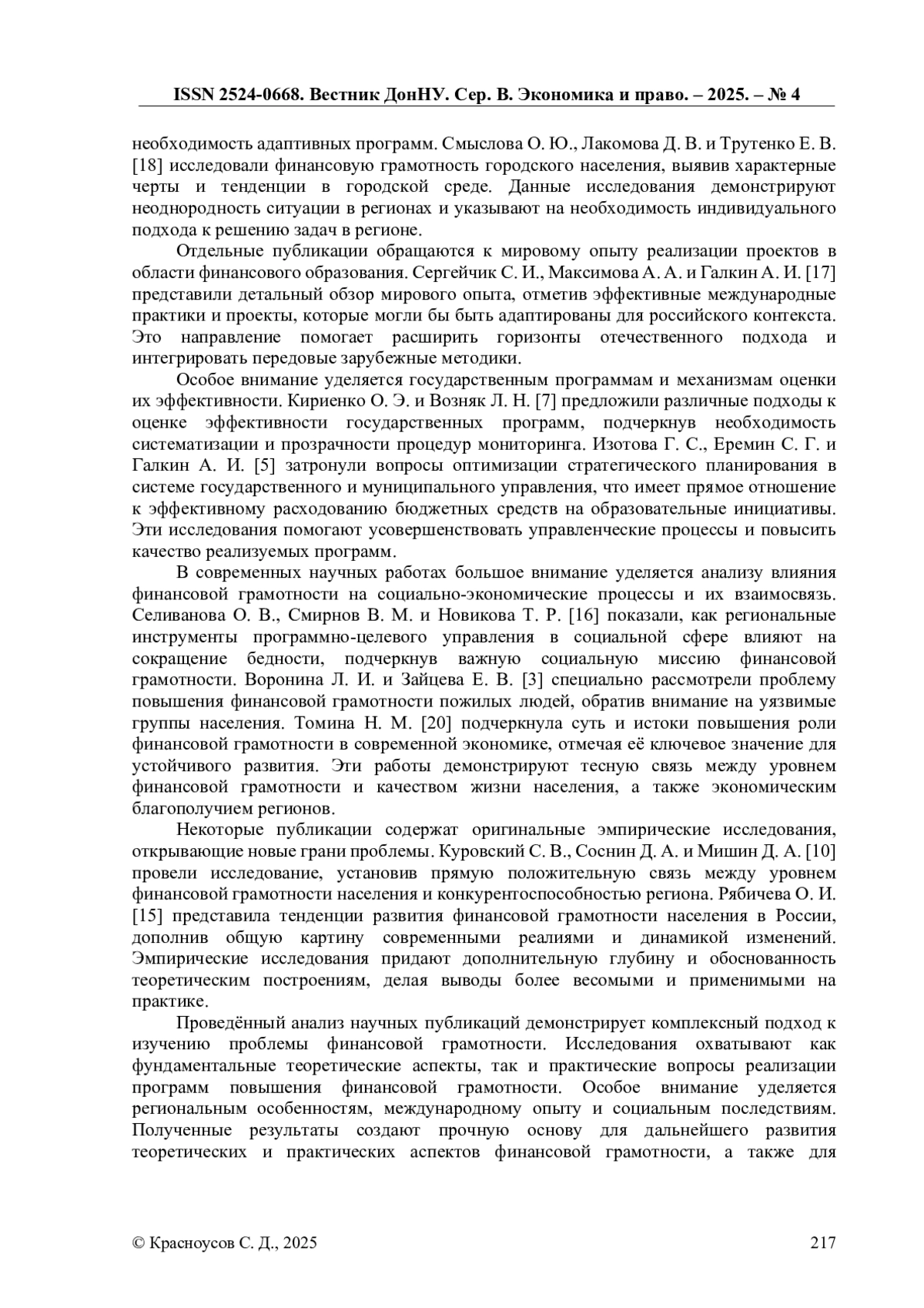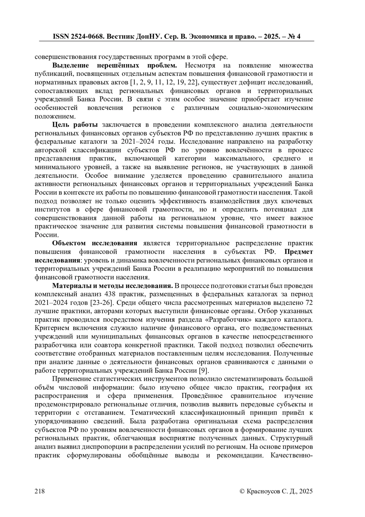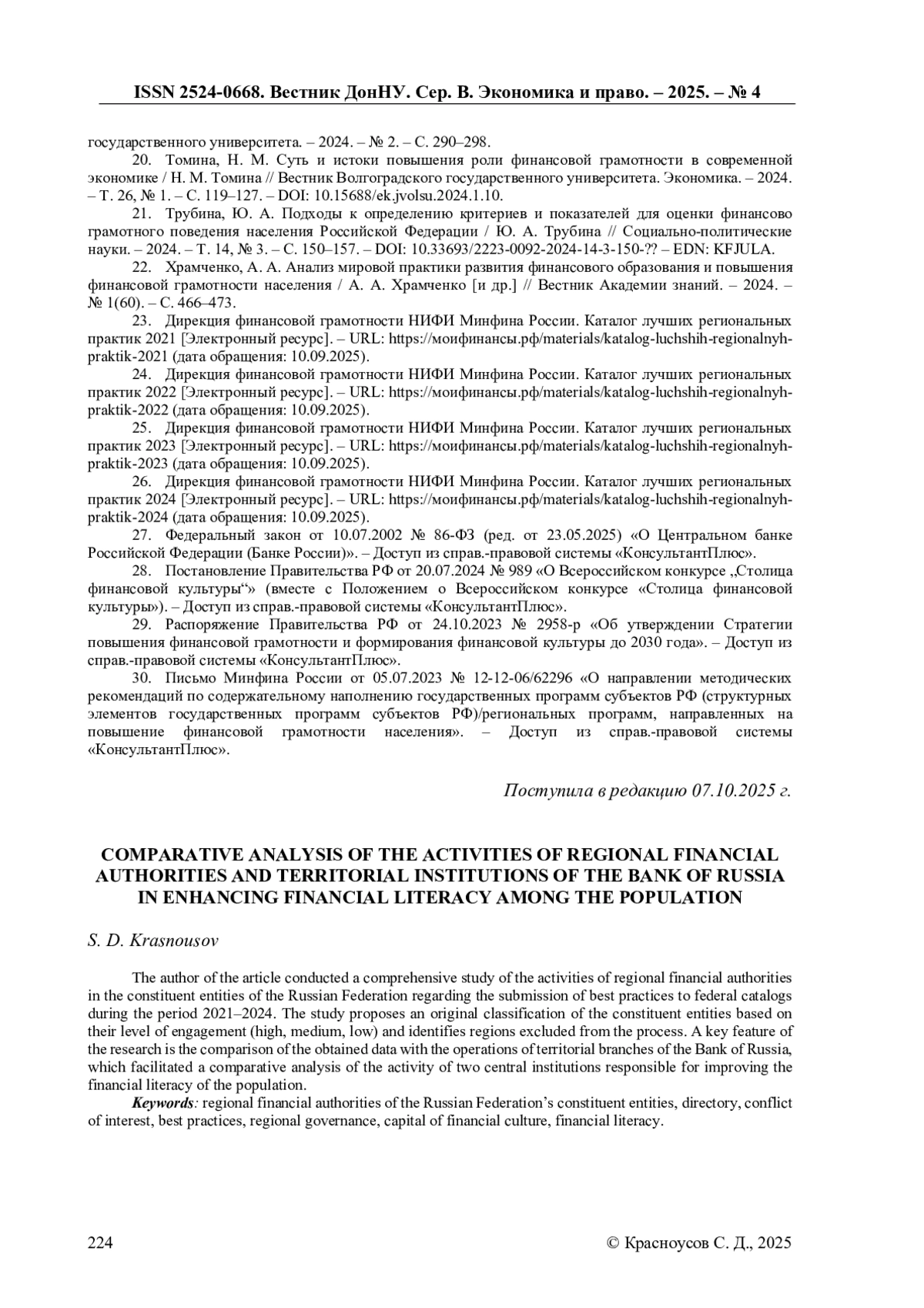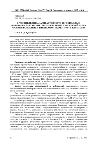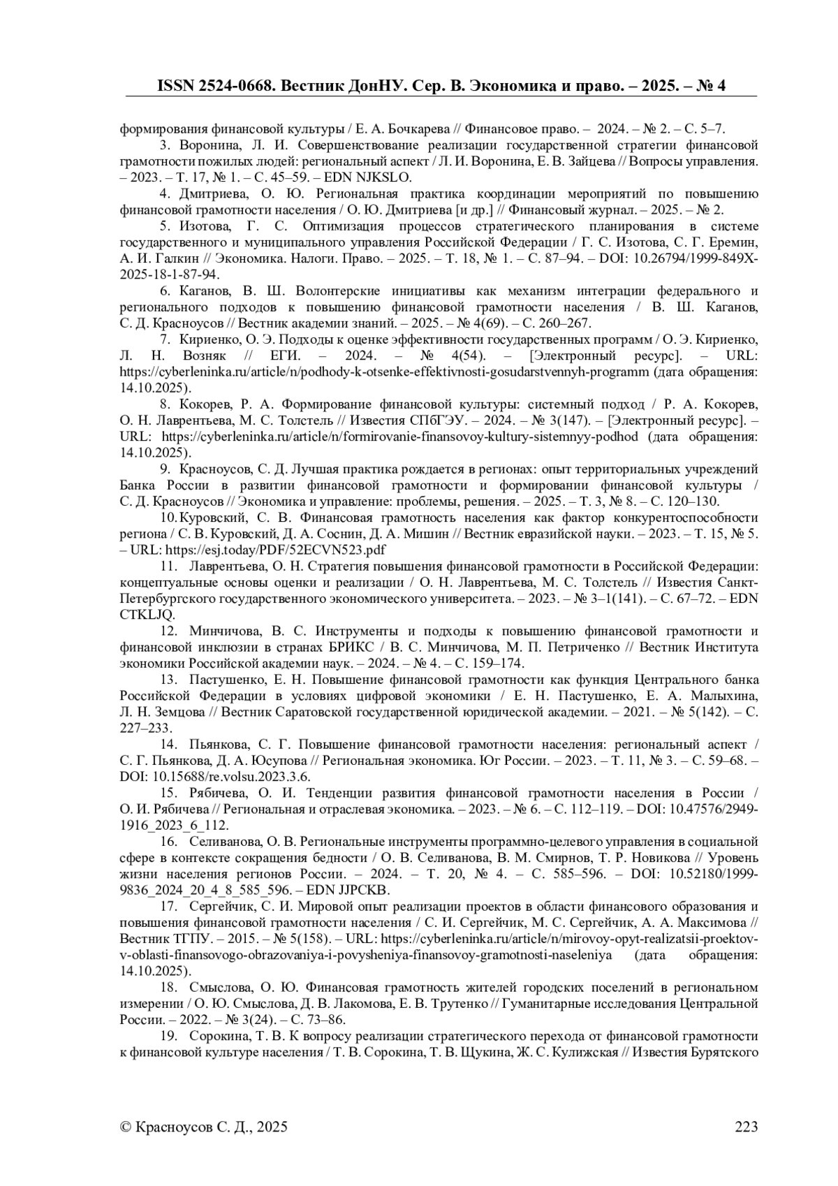 9. Красноусов, С. Д. Лучшая практика рождается в регионах: опыт территориальных учреждений Банка России в развитии финансовой грамотности и формировании финансовой культуры / С. Д. Красноусов // Экономика и управление: проблемы, решения. - 2025. - Т. 3, № 8. - С. 120-130. EDN: HDGUOO