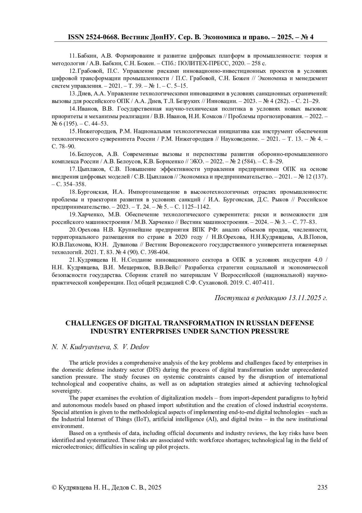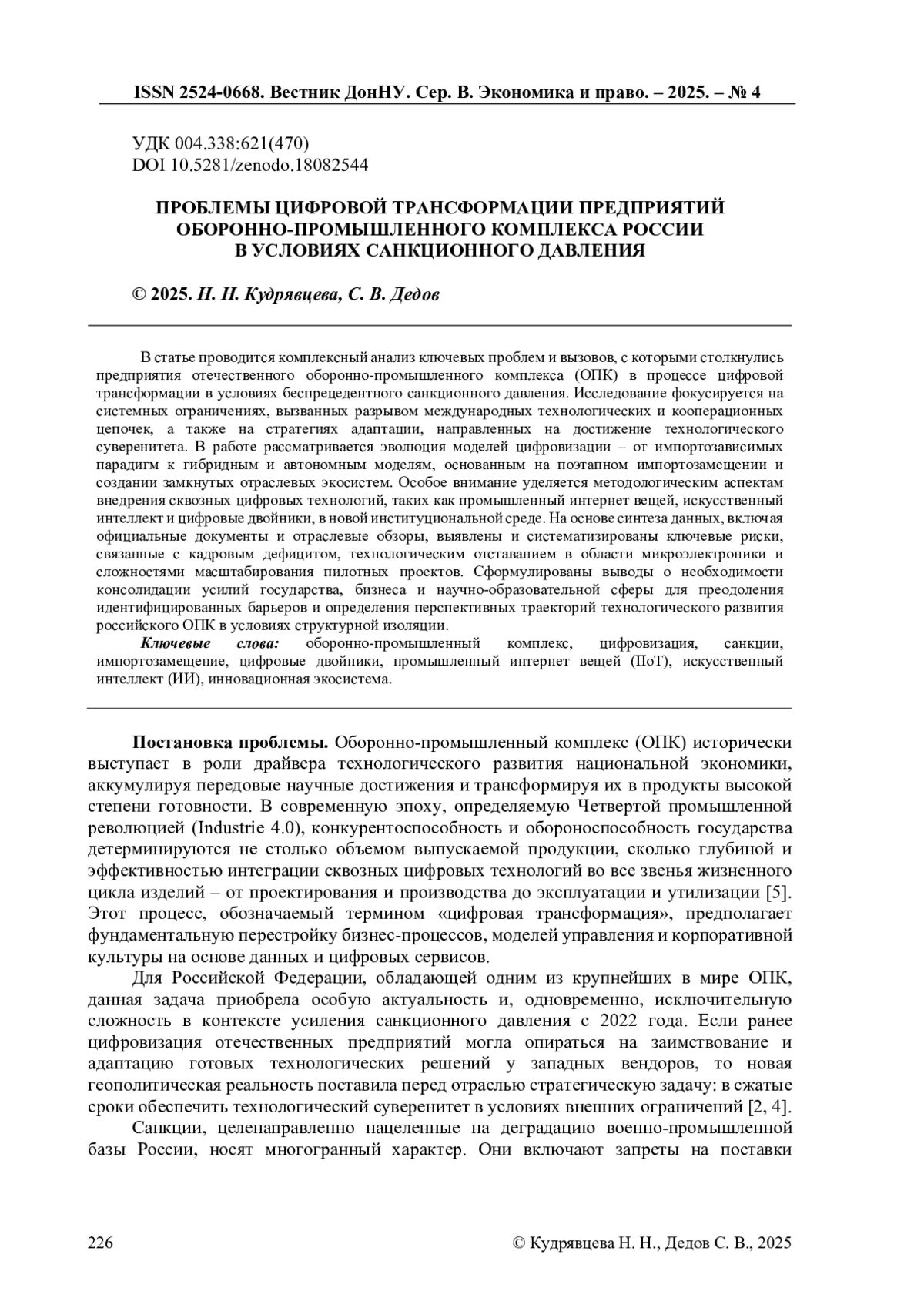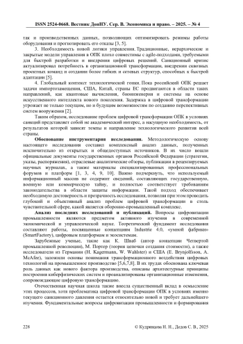 В статье проводится комплексный анализ ключевых проблем и вызовов, с которыми столкнулись предприятия отечественного оборонно-промышленного комплекса (ОПК) в процессе цифровой трансформации в условиях беспрецедентного санкционного давления. Исследование фокусируется на системных ограничениях, вызванных разрывом международных технологических и кооперационных цепочек, а также на стратегиях адаптации, направленных на достижение технологического суверенитета. В работе рассматривается эволюция моделей цифровизации - от импортозависимых парадигм к гибридным и автономным моделям, основанным на поэтапном импортозамещении и создании замкнутых отраслевых экосистем. Особое внимание уделяется методологическим аспектам внедрения сквозных цифровых технологий, таких как промышленный интернет вещей, искусственный интеллект и цифровые двойники, в новой институциональной среде. На основе синтеза данных, включая официальные документы и отраслевые обзоры, выявлены и систематизированы ключевые риски, связанные с кадровым дефицитом, технологическим отставанием в области микроэлектроники и сложностями масштабирования пилотных проектов. Сформулированы выводы о необходимости консолидации усилий государства, бизнеса и научно-образовательной сферы для преодоления идентифицированных барьеров и определения перспективных траекторий технологического развития российского ОПК в условиях структурной изоляции.
