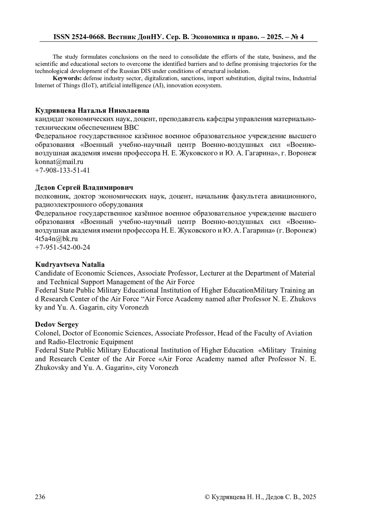 21. Кудрявцева Н. Н. Создание инновационного сектора в ОПК в условиях индустрии 4.0 / Н.Н. Кудрявцева, В.И. Мещеряков, В.В. Вейс // Разработка стратегии социальной и экономической безопасности государства. Сборник статей по материалам V Всероссийской (национальной) научно-практической конференции. Под общей редакцией С.Ф. Сухановой. 2019. С. 407-411. EDN: NCOHWI