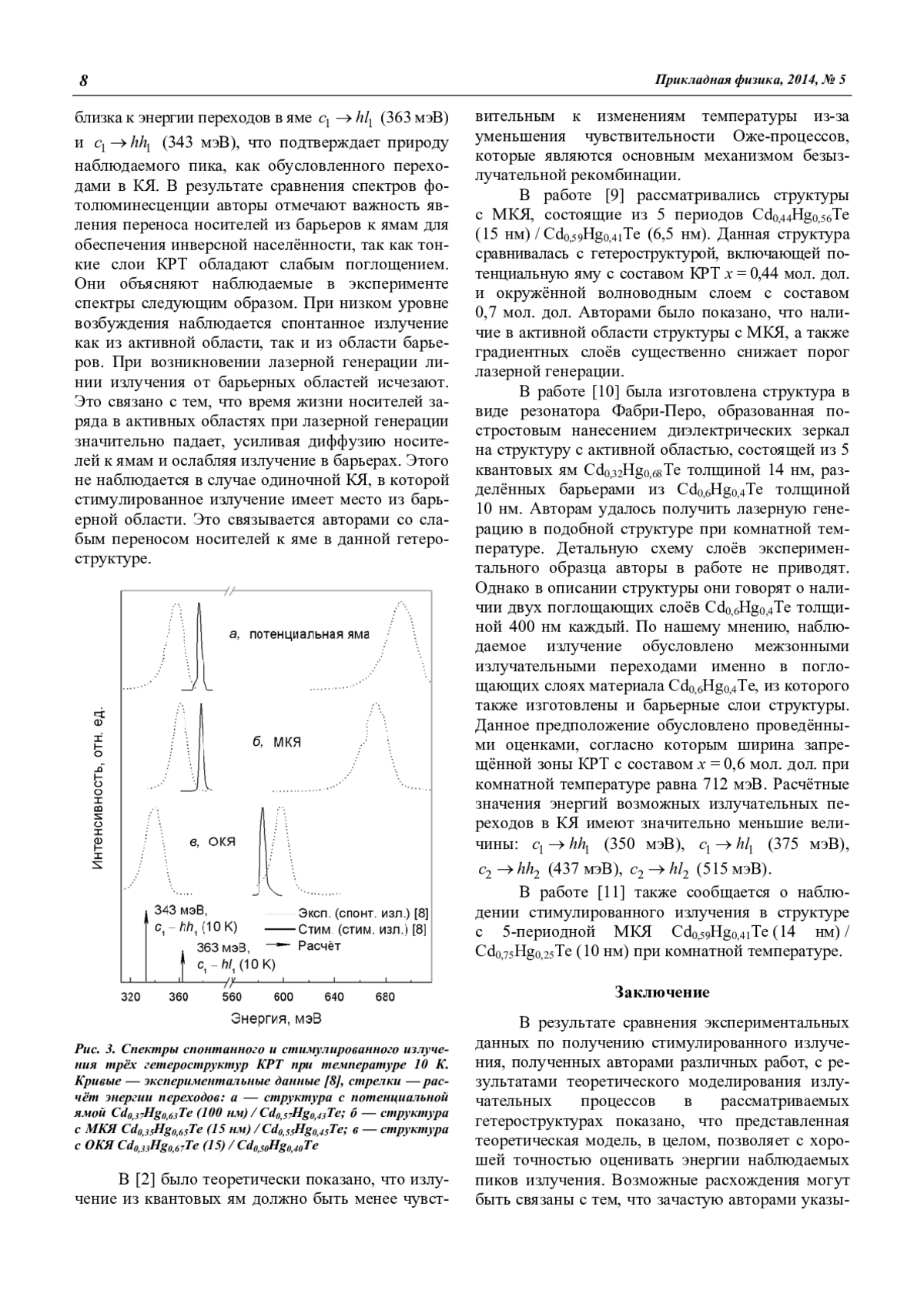 В данной статье представлен анализ имеющихся в настоящее время экспериментальных работ по получению лазерной генерации в структурах CdxHg1-xTe (КРТ) с множественными квантовыми ямами (МКЯ), выращенных методом молекулярнолучевой эпитаксии (МЛЭ). Для рассмотренных структур было проведено моделирование электронного спектра носителей заряда в квантовой яме, рассчитаны энергии оптических переходов и дана интерпретация наблюдаемых в экспериментах пиков спонтанного и стимулированного излучения.