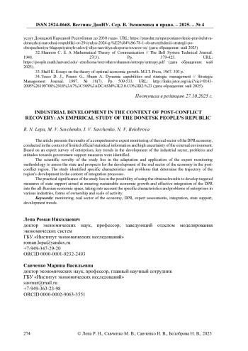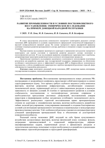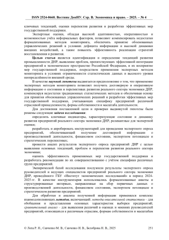 В статье представлены результаты комплексного экспертного мониторинга реального сектора экономики ДНР, проведённого в условиях ограниченности официальной статистической информации и высокой неопределённости внешней среды. На основе экспертного опроса предприятий выявлены ключевые тенденции развития промышленного сектора, проблемы и отношение к мерам государственной поддержки. Научная новизна исследования заключается в адаптации и применении методологии экспертного мониторинга для оценки состояния и перспектив развития реального сектора экономики в постконфликтном регионе. В ходе исследования выявлены специфические характеристики и проблемы, детерминирующие траекторию развития региона в контексте интеграционных процессов. Практическая значимость исследования заключается в возможности использования полученных результатов для разработки адресных мер государственной поддержки, направленных на обеспечение устойчивого экономического роста и эффективной интеграции ДНР в общероссийское экономическое пространство, с учётом специфических характеристик и проблем предприятий различных отраслей, форм собственности и масштабов деятельности.