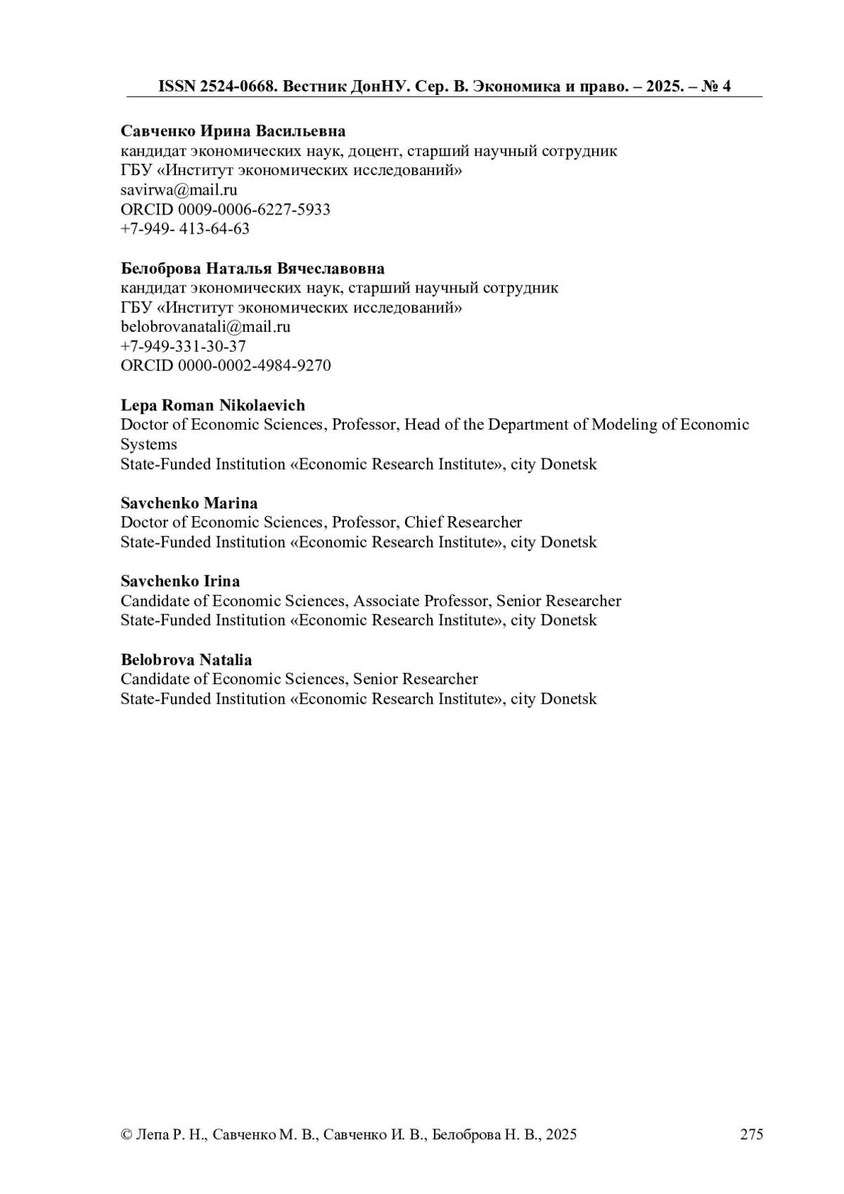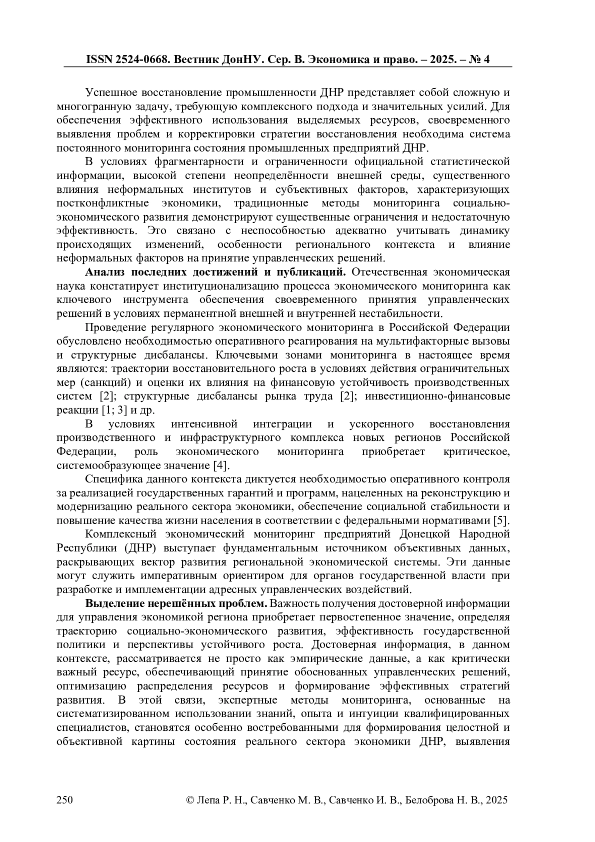 4. Лепа Р. Н., Половян А. В., Савченко И. В. Экспертные методы мониторинга развития предприятий реального сектора экономики ДНР // Вестник Волгоградского государственного университета. Экономика. 2024. Т. 26, № 3. С. 80-96. DOI: 10.15688/ek.jvolsu.2024.3.7 EDN: DULKRP