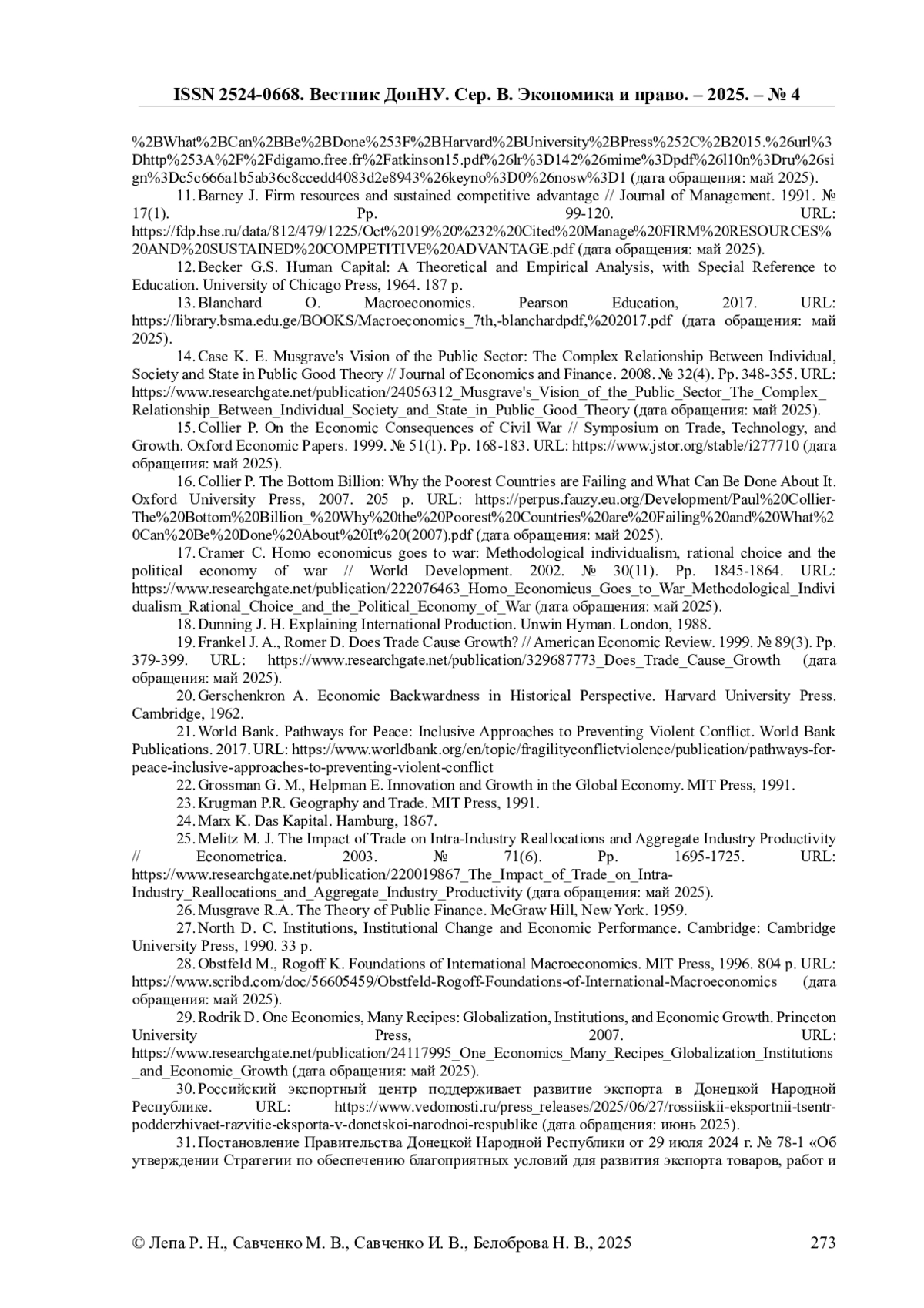 15. Collier P. On the Economic Consequences of Civil War // Symposium on Trade, Technology, and Growth. Oxford Economic Papers. 1999. № 51(1). Рр. 168-183. URL: https://www.jstor.org/stable/i277710 (дата обращения: май 2025).