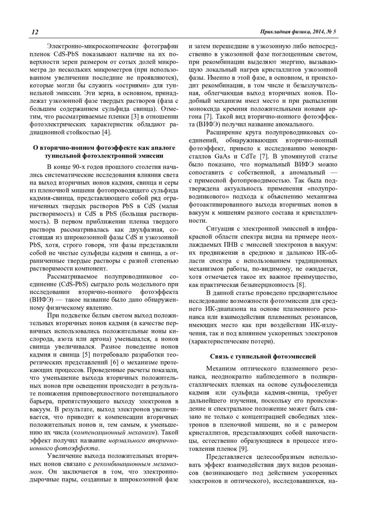 Ранее нами было показано, что увеличение выхода вторичных ионов из полупроводника при подсветке связано с раскачкой кристаллической решетки за счет энергии рекомбинирующих электронно-дырочных пар в узкозонной фазе. Применение подобных рассуждений к электронному газу в полупроводниках наводит на мысль о возможности туннельной фотоэмиссии электронов под действием плазменного резонанса в ближней и средней инфракрасной области спектра. Необходимый рельеф поверхности может быть обеспечен в гетерофазных радиационно-стойких пленках типа CdS-PbS.