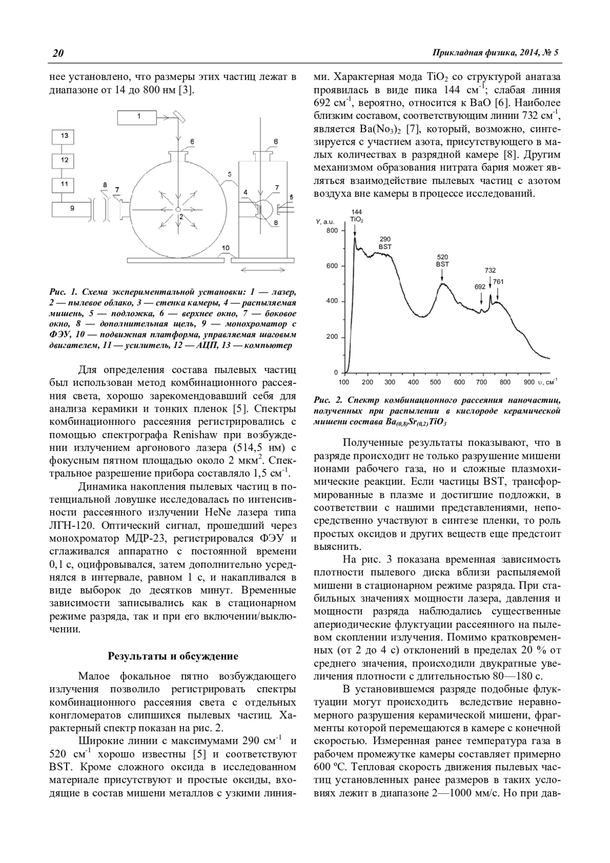 Методом спектроскопии комбинационного рассеяния показано, что в состав пылевых частиц, образовавшихся в плазме кислородного разряда при распылении керамических мишеней, входит как сложный оксид — титанат бария-стронция, так и простые оксиды металлов. Выполненные оценки показали преобладание дрейфовой скорости перемещения наночастиц над тепловой при рабочих параметрах разряда даже при низком значении заряда. Динамика накопления пыли качественно хорошо описывается движением заряженных частиц в продольных электрических полях разряда. Апериодические флуктуации плотности частиц, обусловленные неравномерностью распыления мишени, следует исследовать дополнительно для мишеней разных составов и технологий изготовления. Стабильность потока частиц и их количества в потенциальной ловушке может служить критерием отбора мишеней.