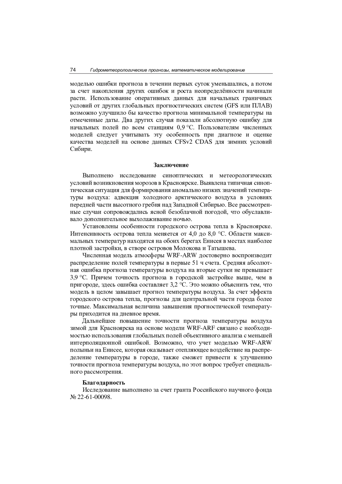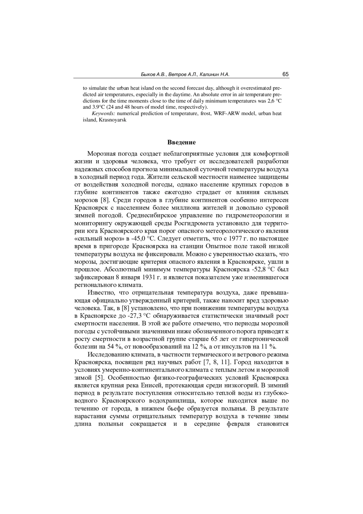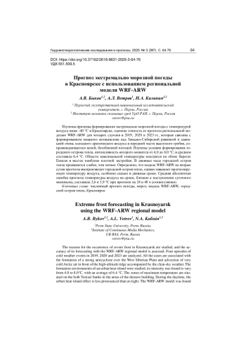 Изучены причины формирования экстремально морозной погоды с температурой воздуха ниже -40 °C в Красноярске, оценена точность ее прогноза региональной моделью WRF-ARW для четырех случаев в 2019, 2020 и 2023 гг., которые связаны с формированием мощного антициклона над Западно-Сибирской равниной и адвекцией очень холодного арктического воздуха в передней части высотного гребня, сопровождающегося ясной, безоблачной погодой. Изучены условия формирования городского острова тепла, интенсивность которого меняется от 4,0 до 8,0 °C, в среднем составила 6,4 °C. Области максимальной температуры находятся на обоих берегах Енисея в местах наиболее плотной застройки. В дневные часы городской остров тепла проявляется слабее, чем ночью. Определено, что модель WRF-ARW на вторые сутки прогноза воспроизводит городской остров тепла, однако завышает прогнозируемую температуру воздуха, особенно сильно в дневные сроки. Средняя абсолютная ошибка прогноза температуры воздуха на сроки, близкие к наступлению суточного минимума, составила 2,6 и 3,9 °C при прогнозе на 24 и 48 ч соответственно.