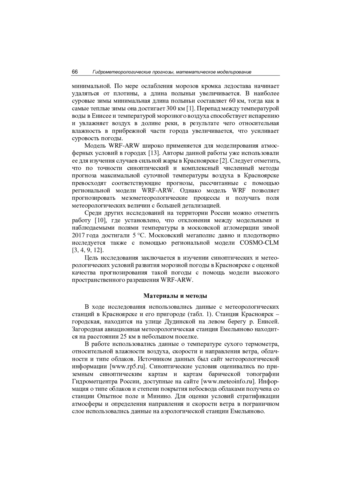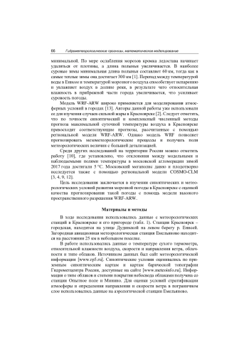Морозная погода создает неблагоприятные условия для комфортной жизни и здоровья человека, что требует от исследователей разработки надежных способов прогноза минимальной суточной температуры воздуха в холодный период года. Жители сельской местности наименее защищены от воздействия холодной погоды, однако население крупных городов в глубине континентов также ежегодно страдает от влияния сильных морозов [8]. Среди городов в глубине континентов особенно интересен Красноярск с населением более миллиона жителей и довольно суровой зимней погодой. Среднесибирское управление по гидрометеорологии и мониторингу окружающей среды Росгидромета установило для территории юга Красноярского края порог опасного метеорологического явления «сильный мороз» в -45,0 °C. Следует отметить, что с 1977 г. по настоящее время в пригороде Красноярска на станции Опытное поле такой низкой температуры воздуха не фиксировали.