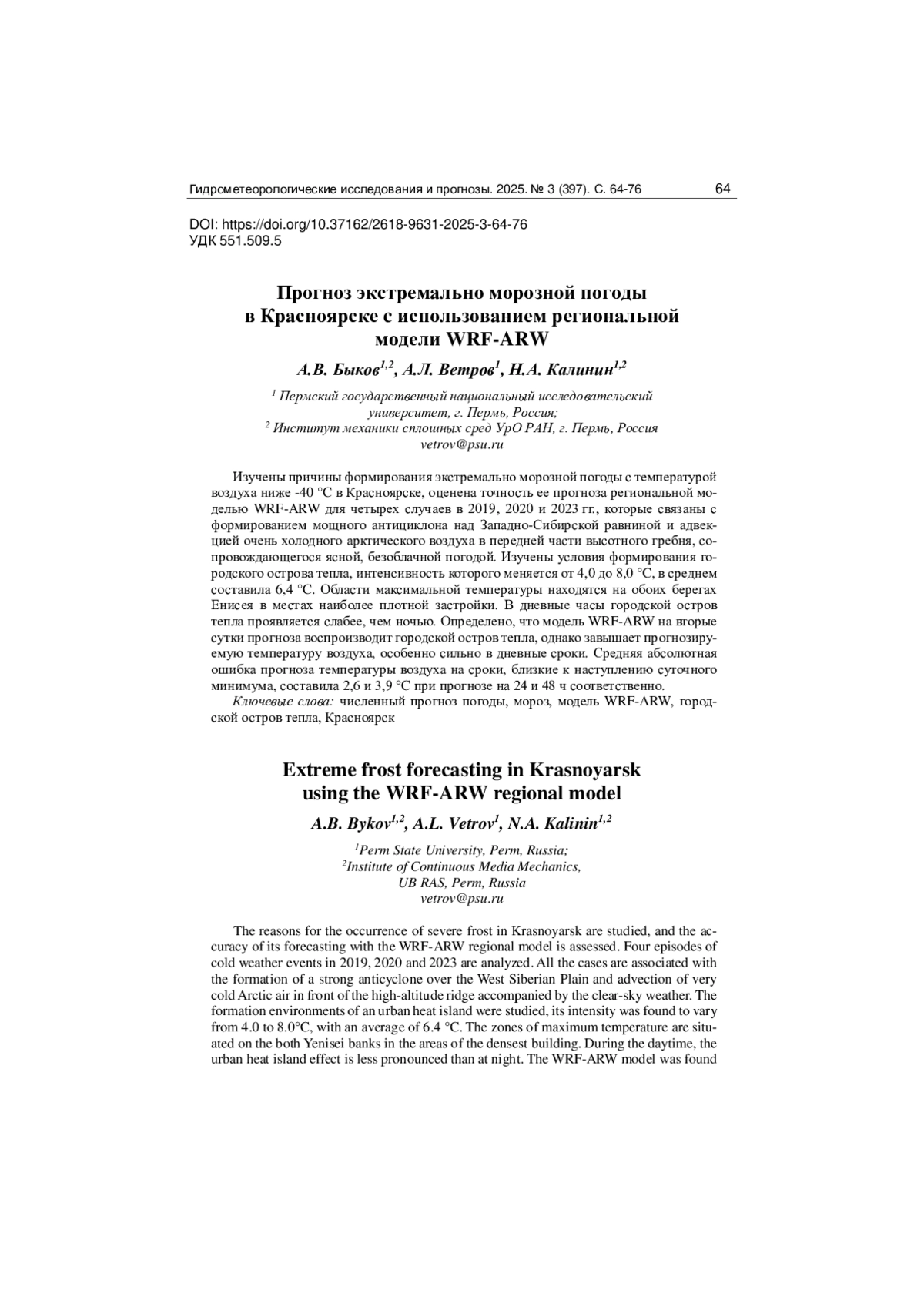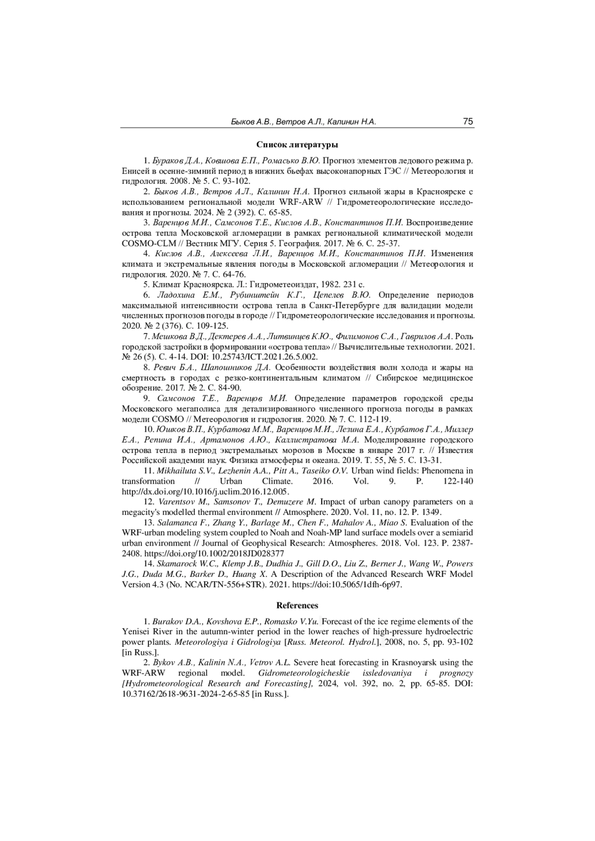 2. Быков А.В., Ветров А.Л., Калинин Н.А. Прогноз сильной жары в Красноярске с использованием региональной модели WRF-ARW // Гидрометеорологические исследования и прогнозы. 2024. № 2 (392). С. 65-85. EDN: MSYEGG