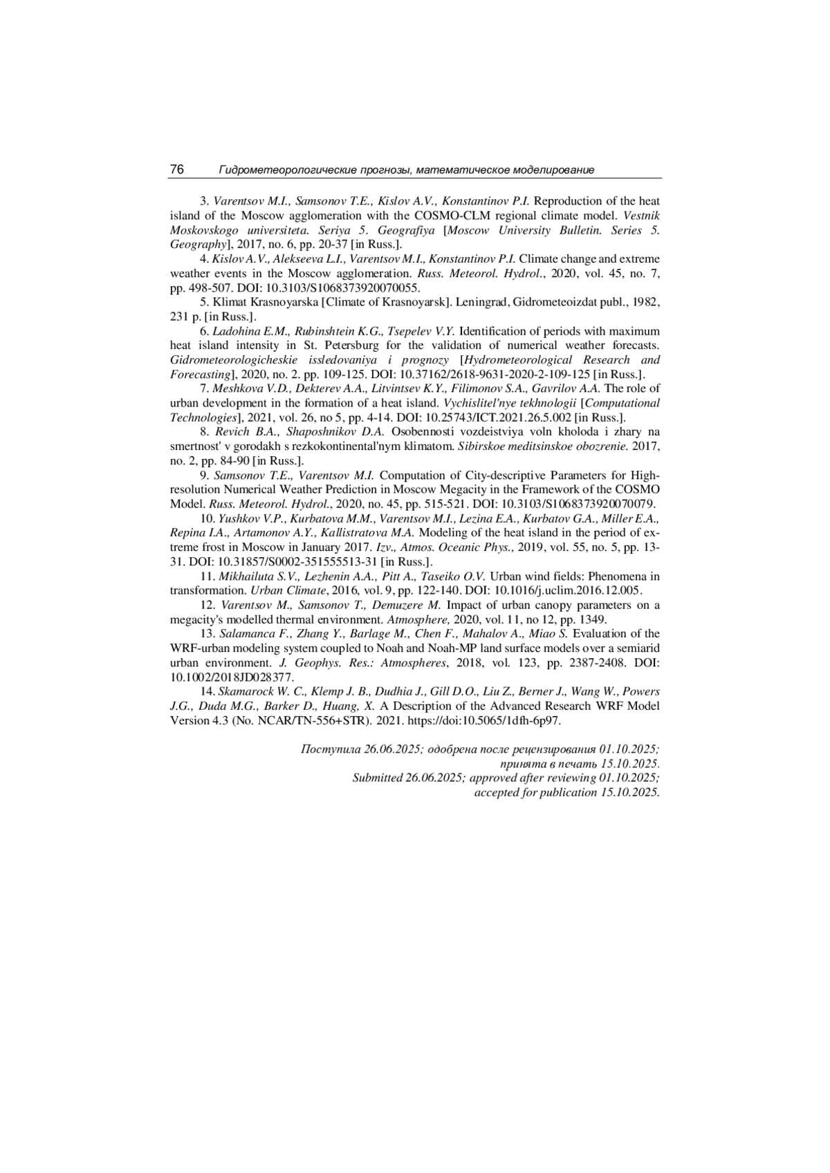 9. Самсонов Т.Е., Варенцов М.И. Определение параметров городской среды Московского мегаполиса для детализированного численного прогноза погоды в рамках модели COSMO // Метеорология и гидрология. 2020. № 7. С. 112-119. EDN: IRDBCD