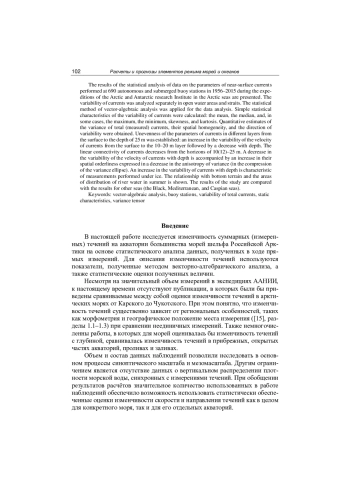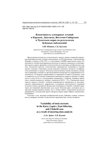 В настоящей работе исследуется изменчивость суммарных (измеренных) течений на акватории большинства морей шельфа Российской Арктики на основе статистического анализа данных, полученных в ходе прямых измерений. Для описания изменчивости течений используются показатели, полученные методом векторно-алгебраического анализа, а также статистические оценки полученных величин. Несмотря на значительный объем измерений в экспедициях ААНИИ, к настоящему времени отсутствуют публикации, в которых были бы приведены сравниваемые между собой оценки изменчивости течений в арктических морях от Карского до Чукотского. При этом понятно, что изменчивость течений существенно зависит от региональных особенностей, таких как морфометрия и географическое положение места измерения ([15], разделы 1.1–1.3) при сравнении неединичных измерений.